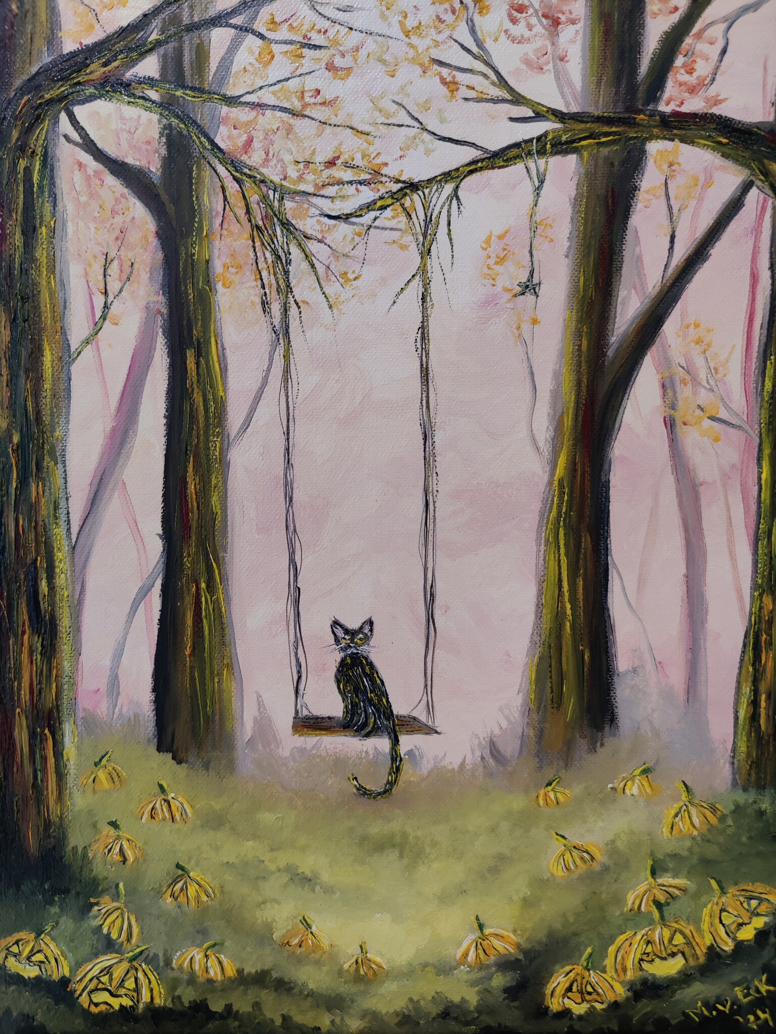 Mysterieus Kat Olieverf Oilpainting Fantasie Kalebassen Forest Fantasy Pompoen Pompoenen Mysterious Pumpkins Pumpkin Celebration Mystery Halloween Olieverfopdoek Fantasyart Samhain Zwartekat Blackcat Fantasiekunst Halloweennight Samhainnight Halloweennacht