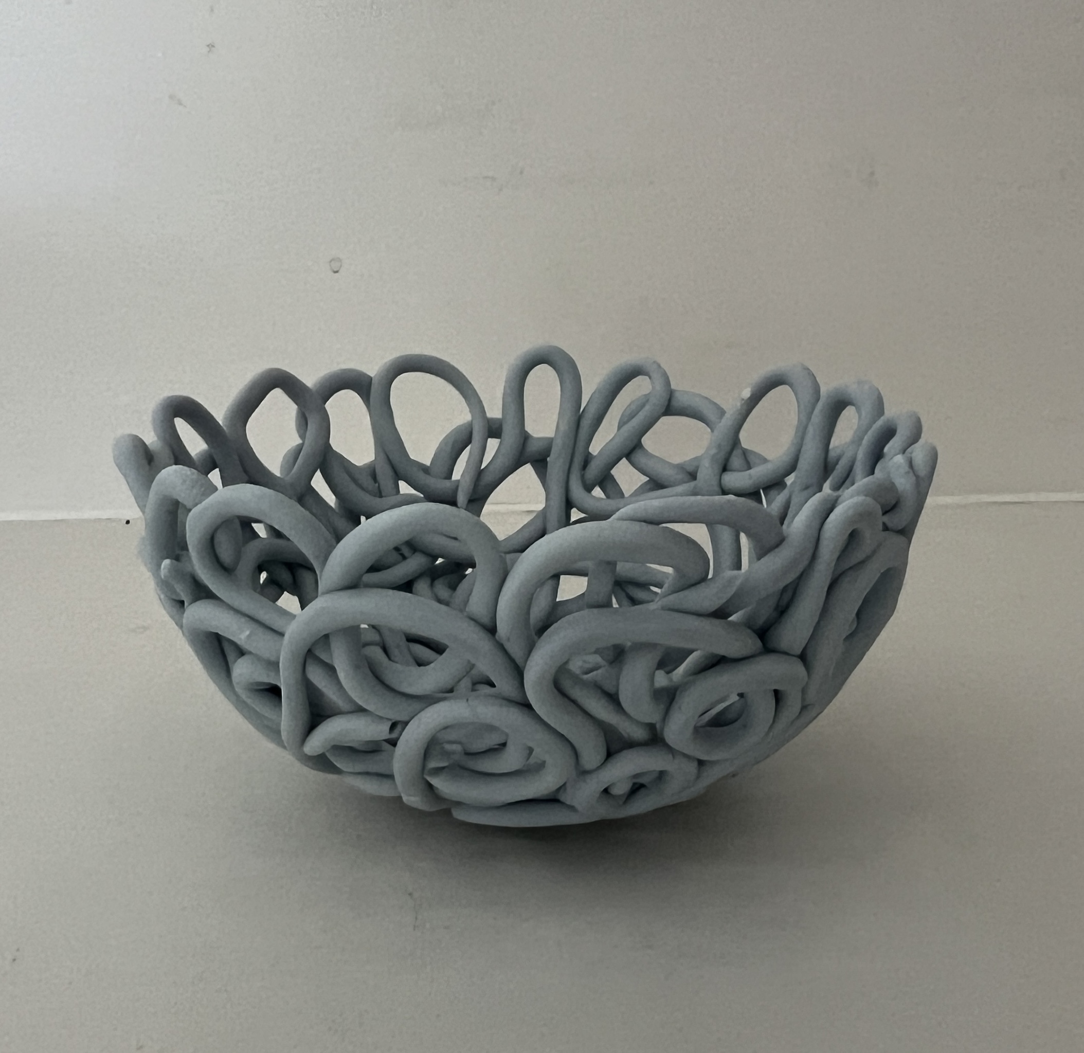 Handgerolde spaghettislierten van porseleinklei die tezamen een schaaltje vormen. Van te voren is het porselein gemengd met blauw pigment. Ongeglazuurd wat het porselein een mooier effect geeft.
