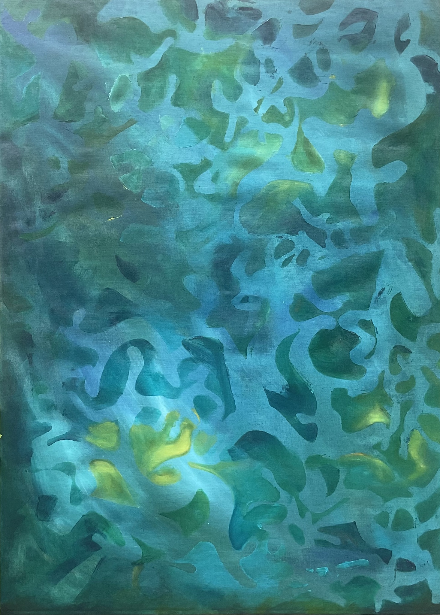 Trots ben ik op dit schilderij. Tussen de schaduw van groen en blauw is het stil. Donkergroen vermengt zich met de diepte van aqua blauw terwijl het licht groen als een zachte nevel door het geheel zweeft, een licht blauwe bries, de noten dwalen, versmelten, verdwijnen in de leegte. Het is een melodie zonder begin of einde, gedragen door de stilte, zoals het bos ademt in een onzichtbaar ritme.