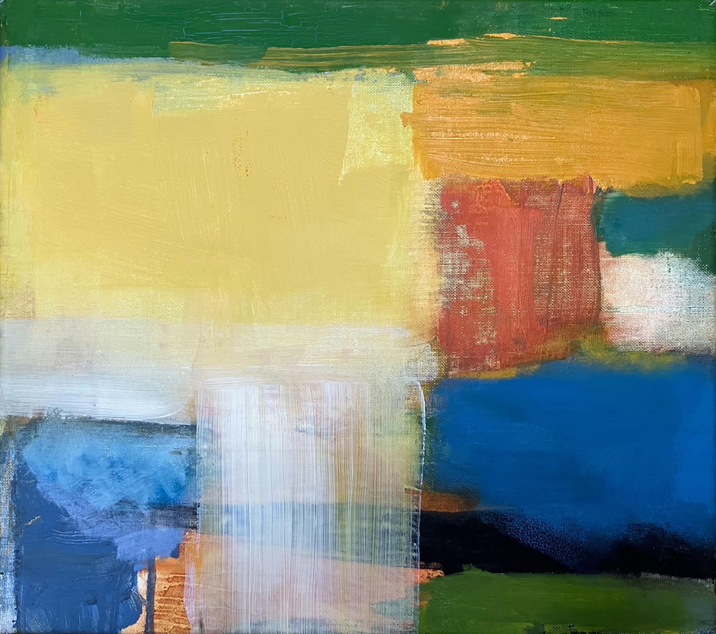 Schilderijen, collages en tekeningen. Een poëzie van landschappelijke elementen, een expressie van verlangen naar verstilling.