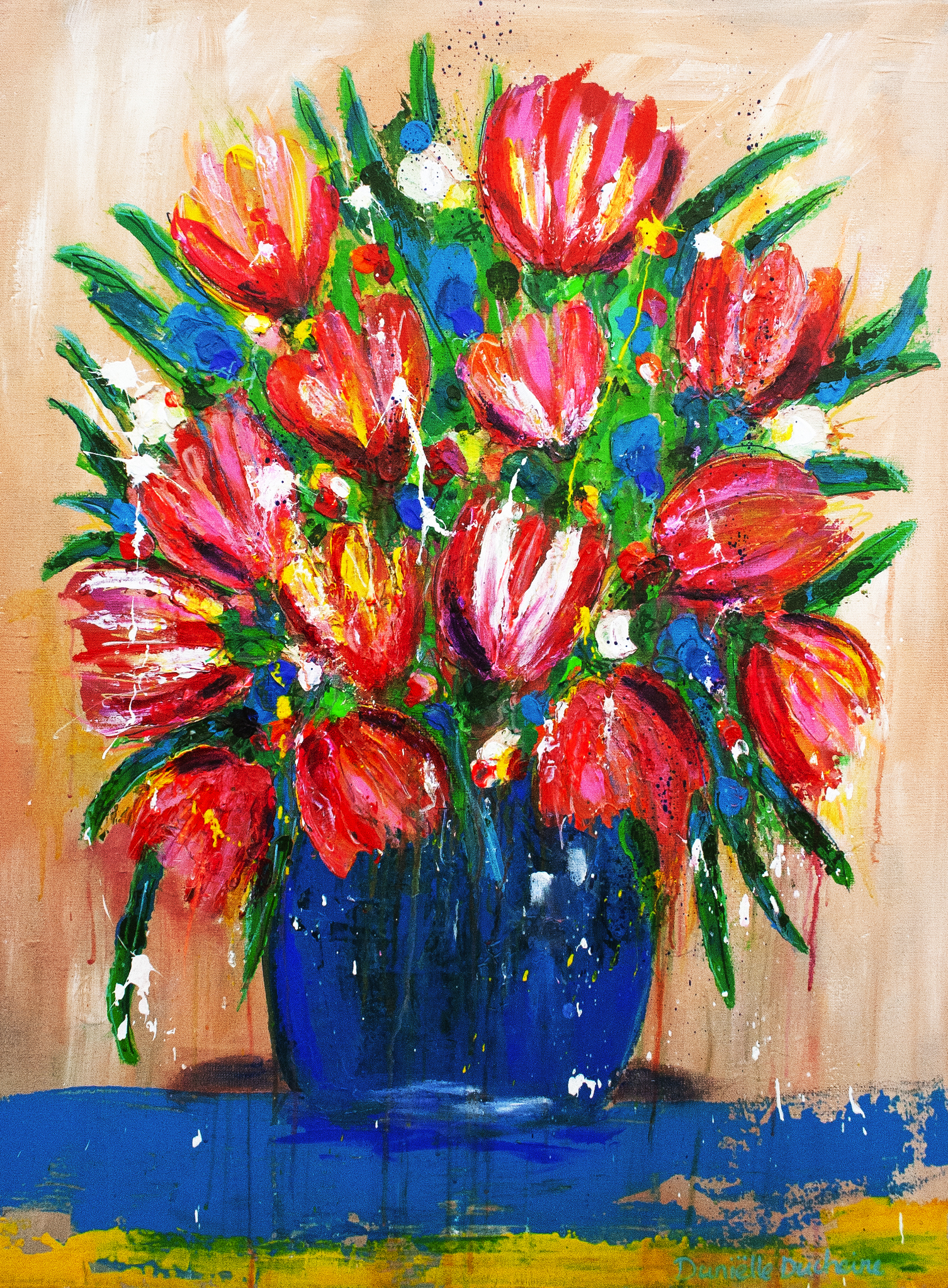 Ik ben Daniëlle Ducheine, de kleurverslaafde kunstenaar. Mijn portretten en bloemen knallen van het doek en brengen kleur, energie en vreugde in elke ruimte.