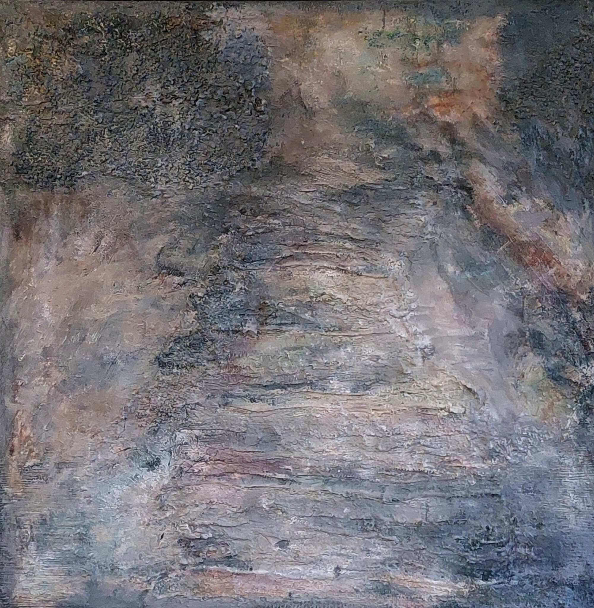 Iets in de buitenwereld intrigeert mij en door deze impressie uit te werken wordt zij blijvend deel van mijn binnenwereld. Laag na laag bouw ik aan de uiteindelijke vorm. Tijdens het werken komt er een stroom van associaties op gang. Het is een constant zoeken naar evenwicht tussen de verf en de andere materialen.