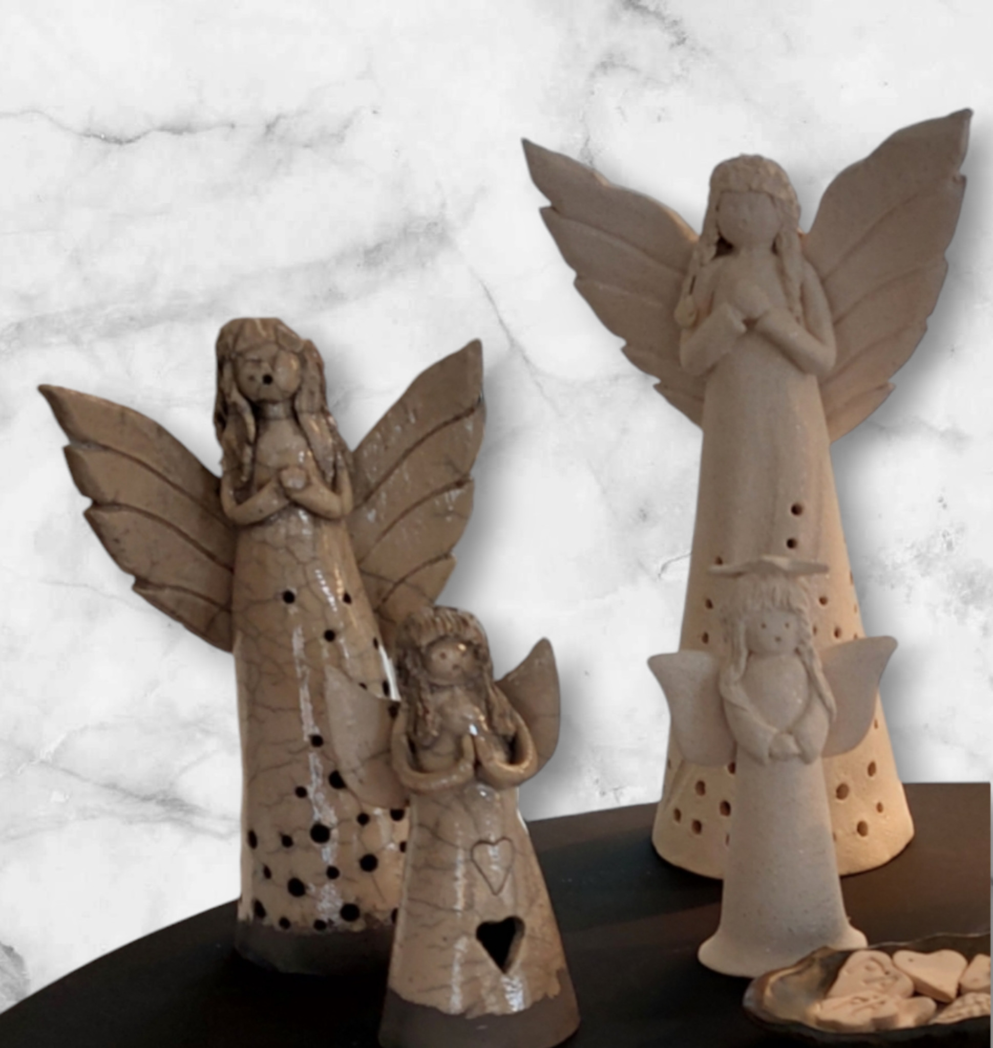 Engeltjes groot en klein, sommige zijn geglazuurd en sommige zijn Raku gestookt.