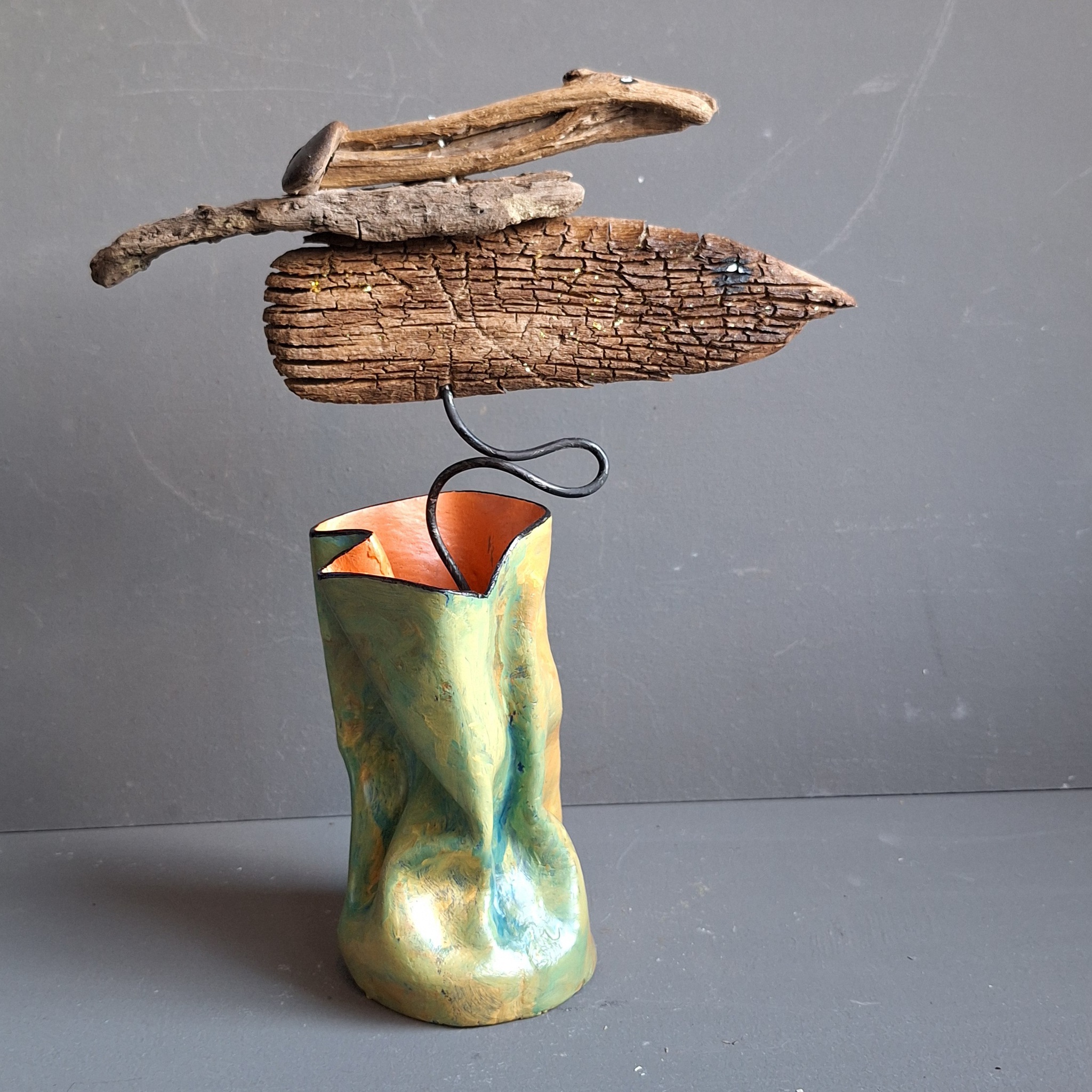 Kreukelvaasje met driftwood flower luchtdrogende klei.K18