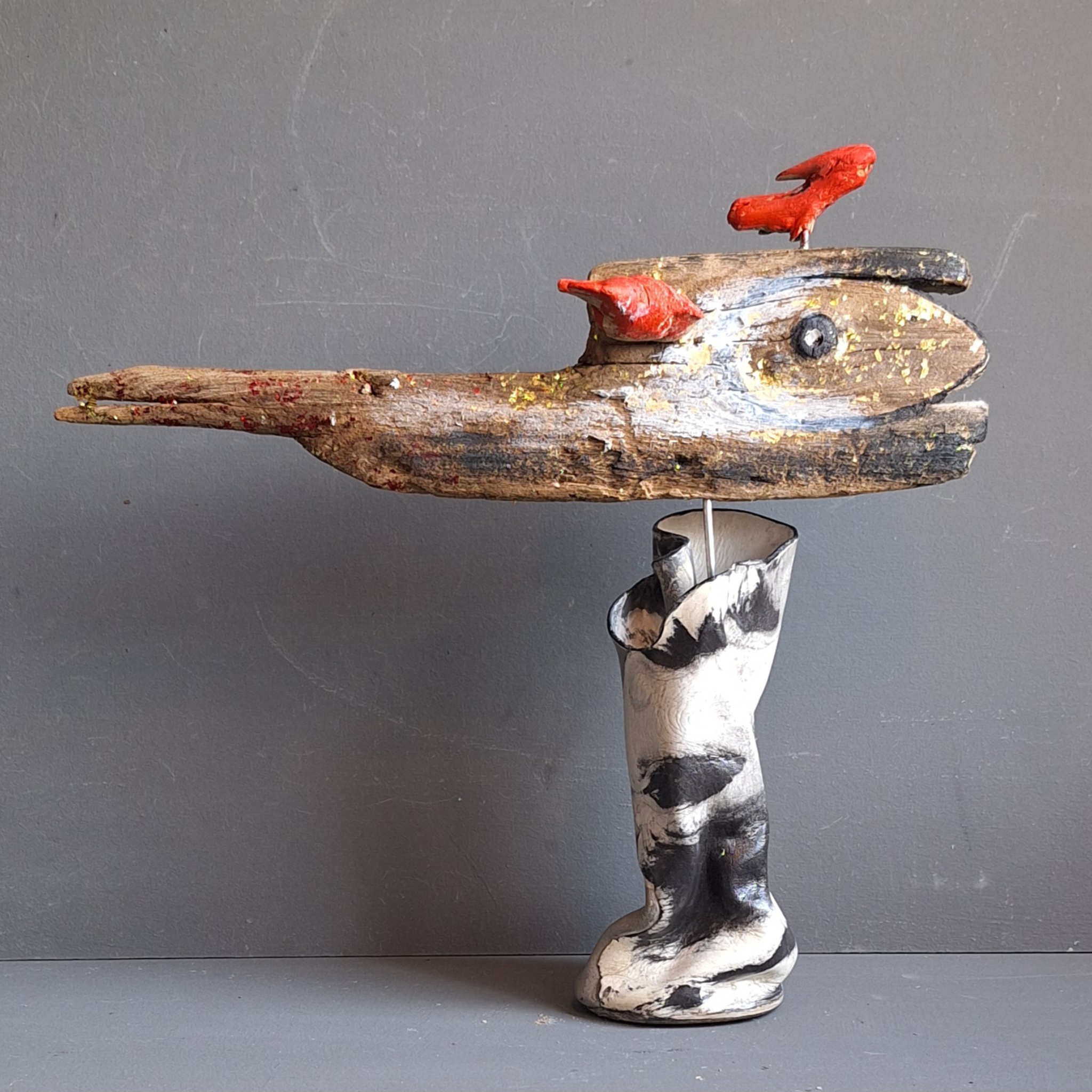 Kreukelvaasje met driftwood flower luchtdrogende klei.K36