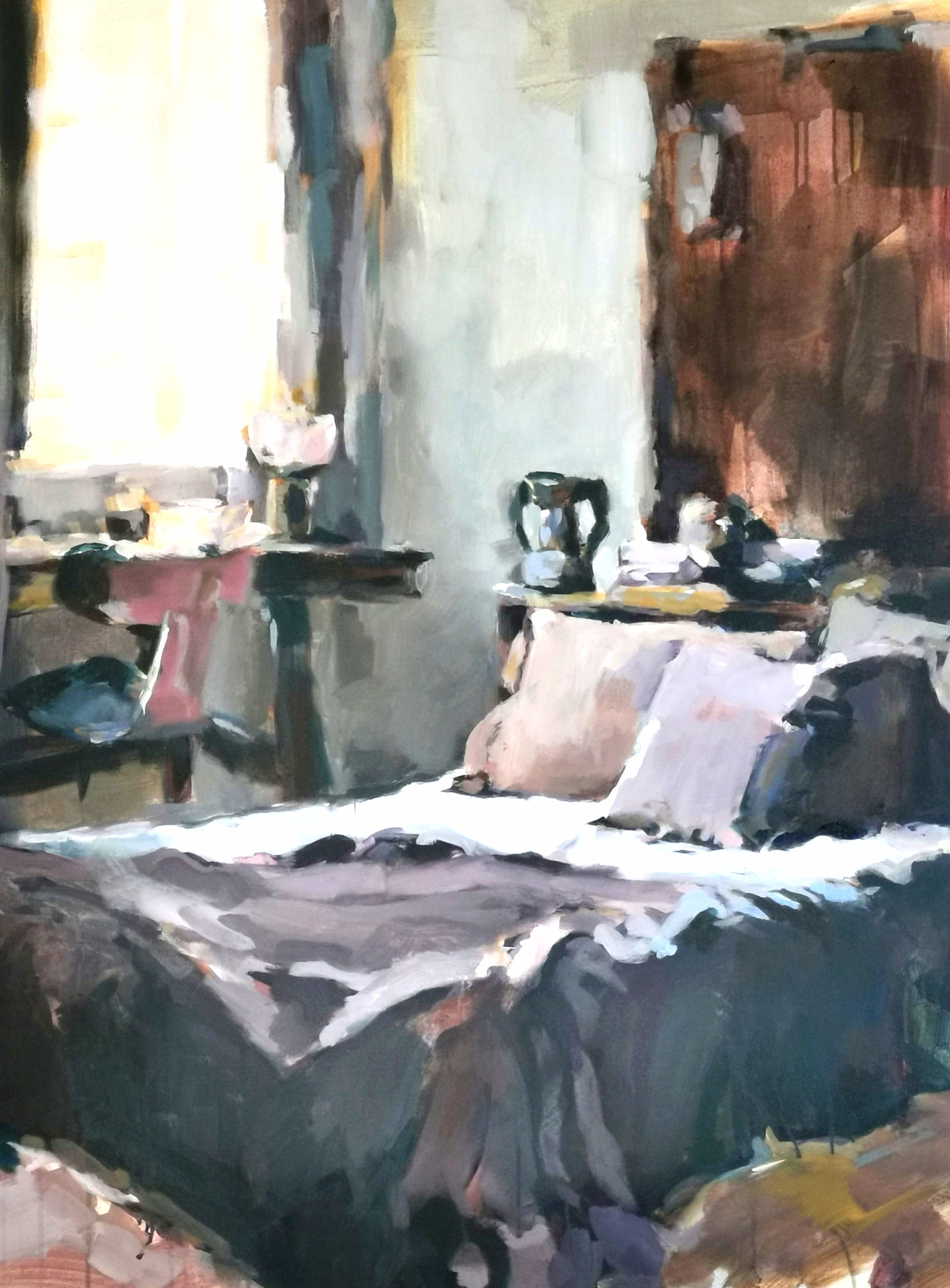 Van binnen naar buiten kijken staat centraal. Daarbij een focus op het verkennen van de diepte van kleur en de kunst van het expressief vastleggen van licht op doek.