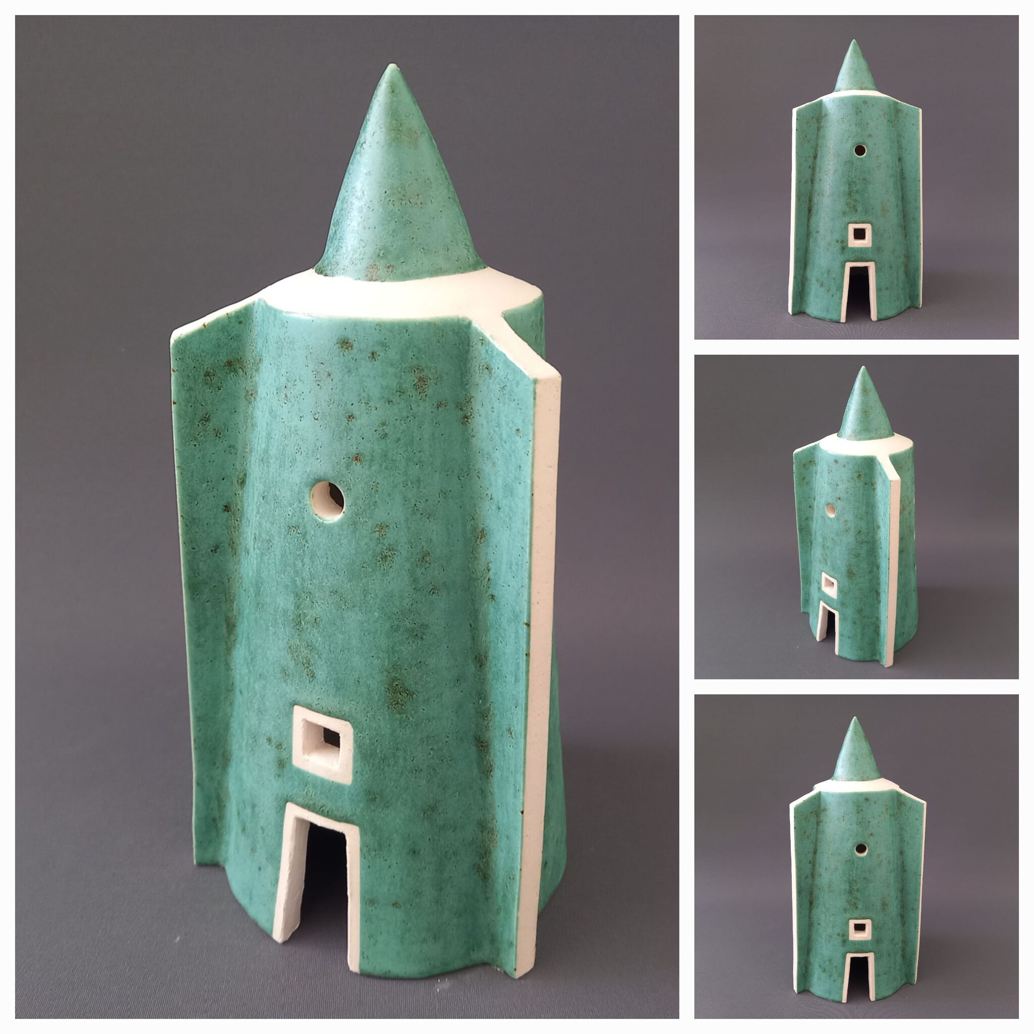 Kasteeltoren met steunberen. Witte klei en een Mintgroen vlekjesglazuur