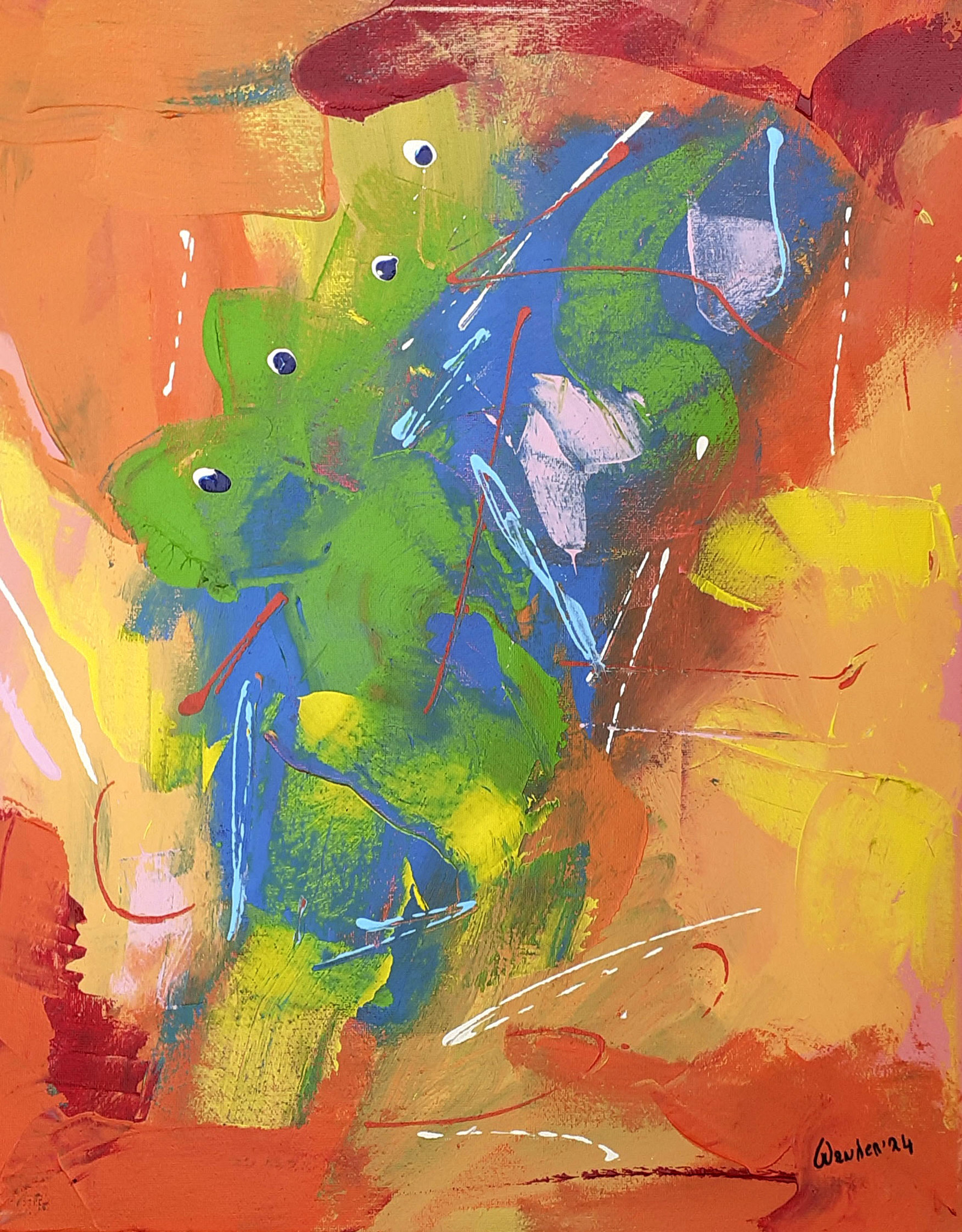 Een mix van technieken en stijlen , van wild abstract, naar figuratief naar strak bijna grafisch.