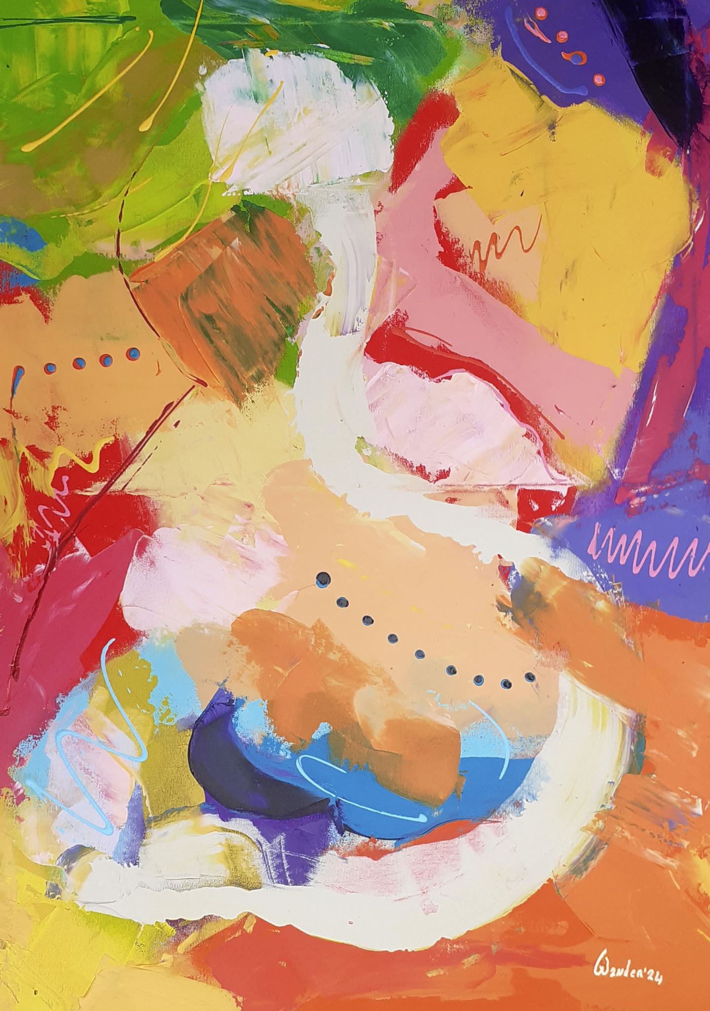 Een mix van technieken en stijlen , van wild abstract, naar figuratief naar strak bijna grafisch.