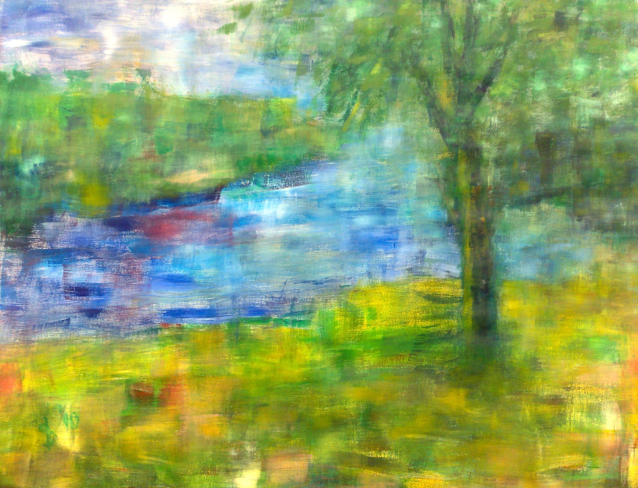 Het begin van de lente, een berk net in het blad, de blauwe hemel spiegelt zich in het water ... ca 140 x 160 cm, acrylverf op papier