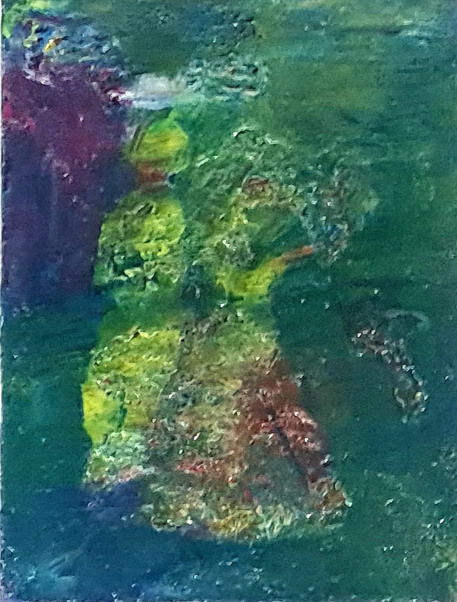 Het paar, omhuld door tinten van geel, rood en paars, lijkt gevangen in een intieme omhelzing. Hun vormen zijn onscherp, alsof ze bijna oplossen in de omgeving, maar hun aanwezigheid is onmiskenbaar. De korrelige textuur van het schilderij geeft het gevoel dat hun verbinding niet alleen fysiek is, maar verweven met tijd en herinnering. Dit is niet zomaar een moment; het is een getuigenis van een liefde die weerstand heeft geboden aan de krachten van verval en vergetelheid.