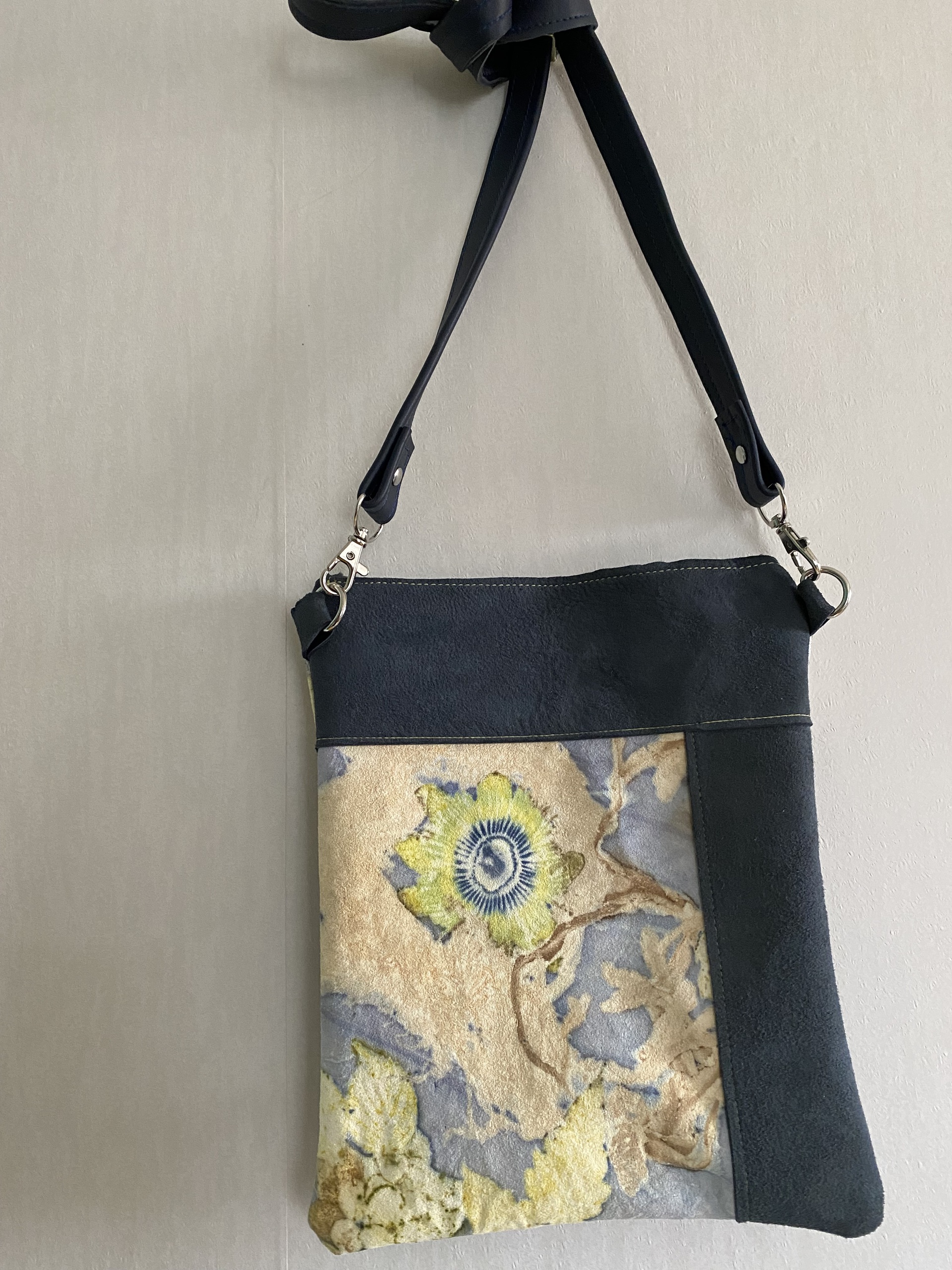 Deze tas is gemaakt van schapenleer en runderleer. Op het schapenleer heb ik o.a. zeewier geprint en een passiebloem. Het is licht van gewicht. De tas sluit met een rits en heeft een lange schouderriem.