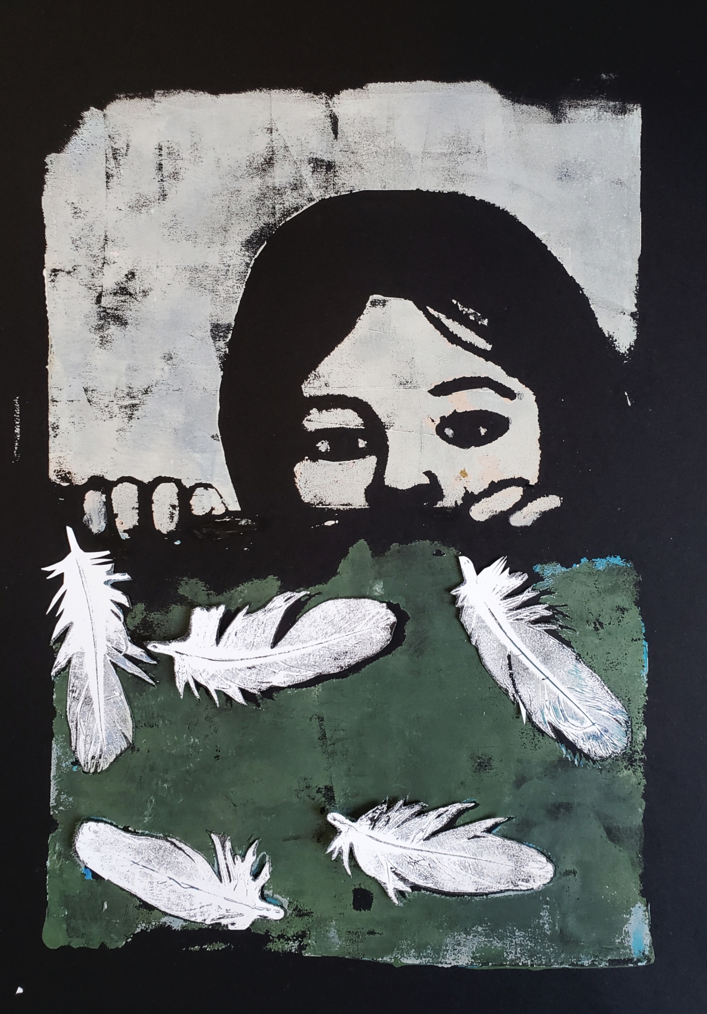 Gelprint op zwart papier van een meisje dat wakker ligt, veertjes liggen op haar deken.