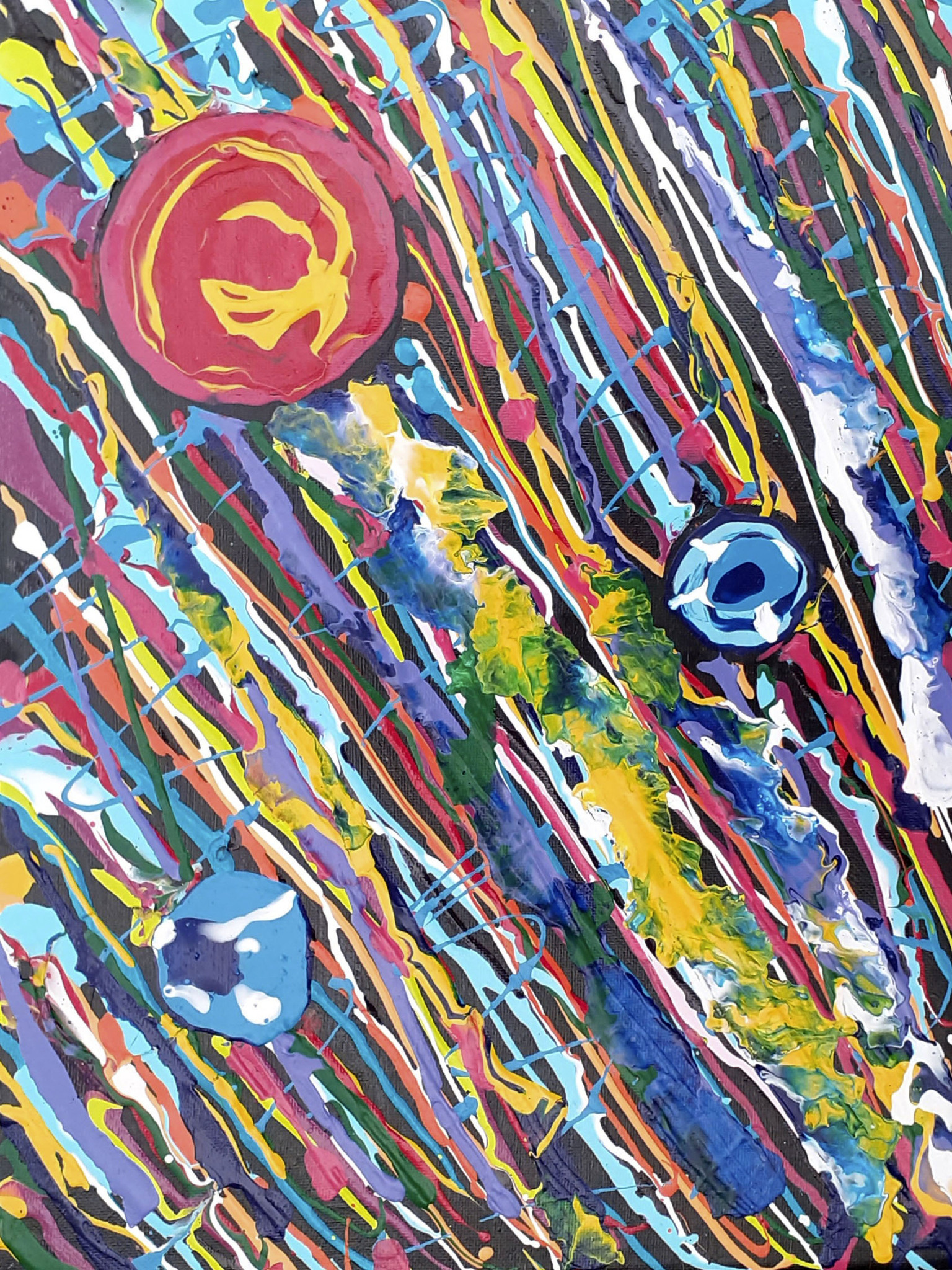 Een mix van technieken en stijlen , van wild abstract, naar figuratief naar strak bijna grafisch.