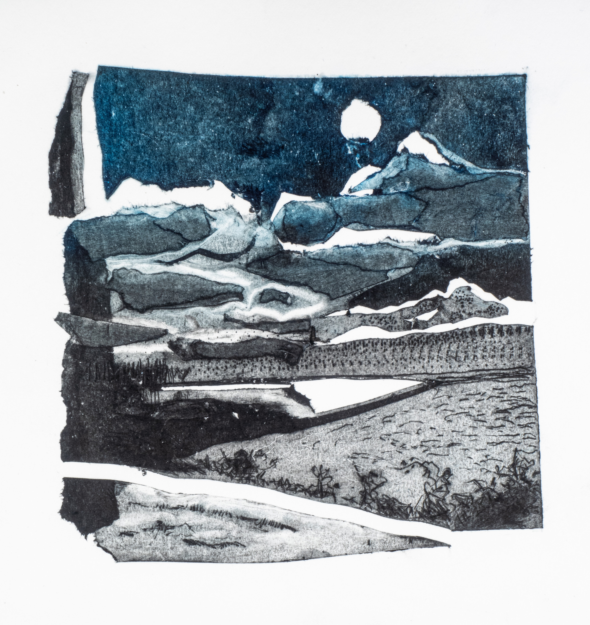 Zee Zon Zwart Landschap Water Maan Natuur Bergen Nacht Donker Grafiek Collage Uitzicht Zwartwit Print Gedrukt Melancholie Uitgeknipt Printmaking