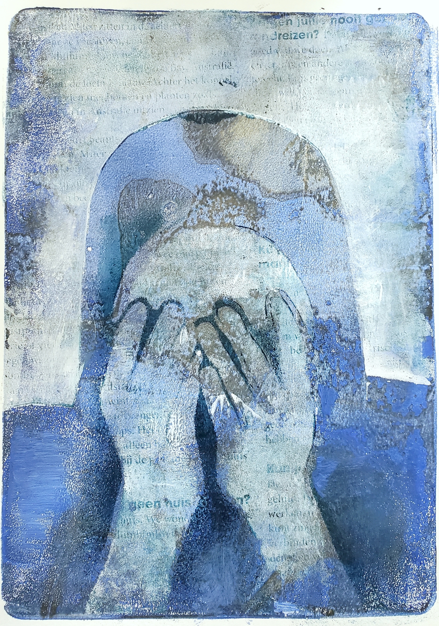 Een illustratie van een vrouw die de handen voor de ogen slaat, gemaakt met gelprint-techniek en sjabloondruk