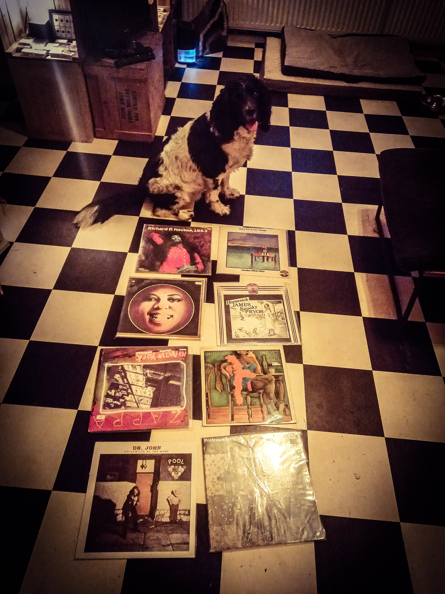 Cuddle the dog and his vinyl collection 45