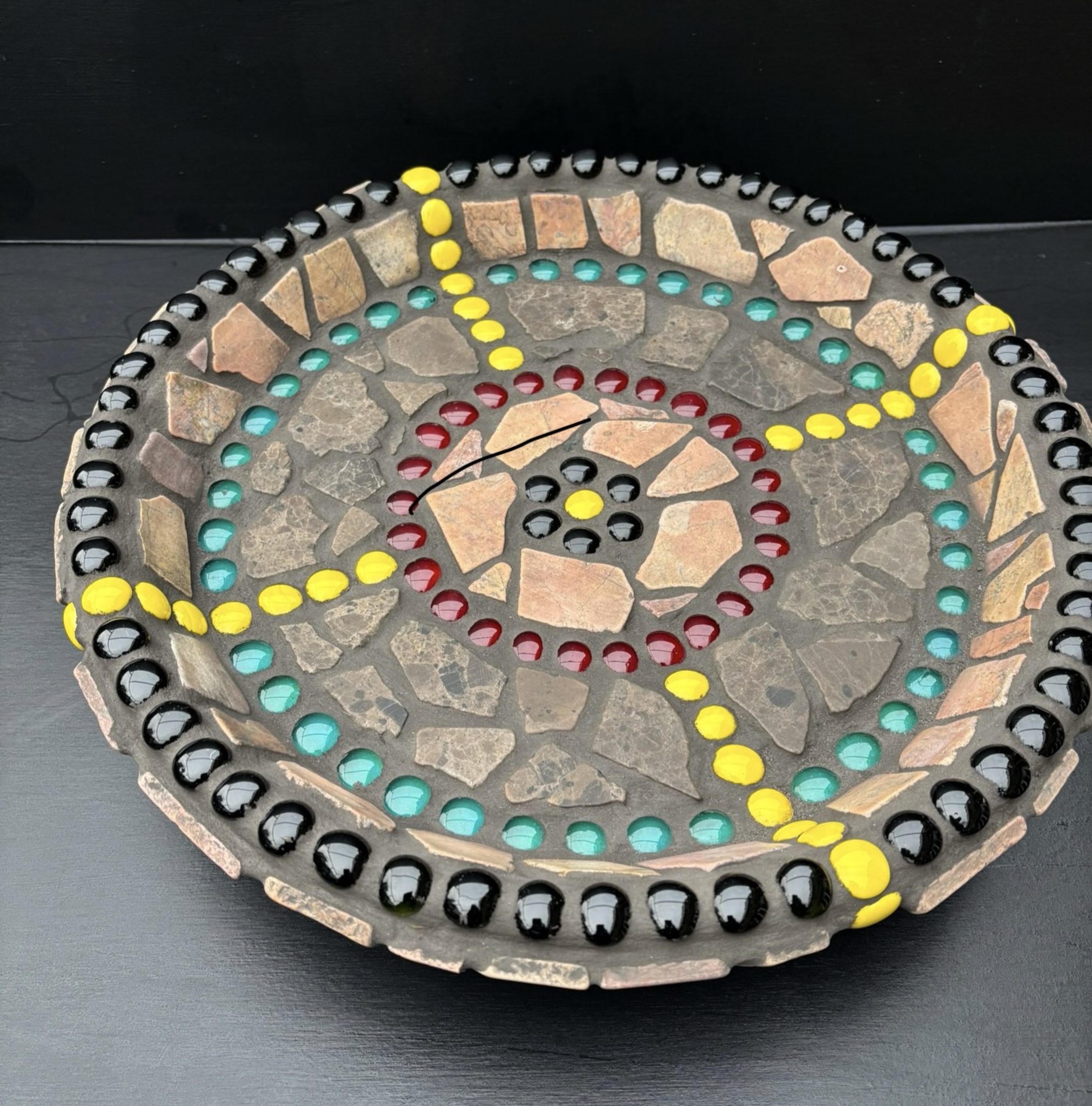 Terracotta vogelschaal op pootjes bewerkt met natuursteen en glas.
