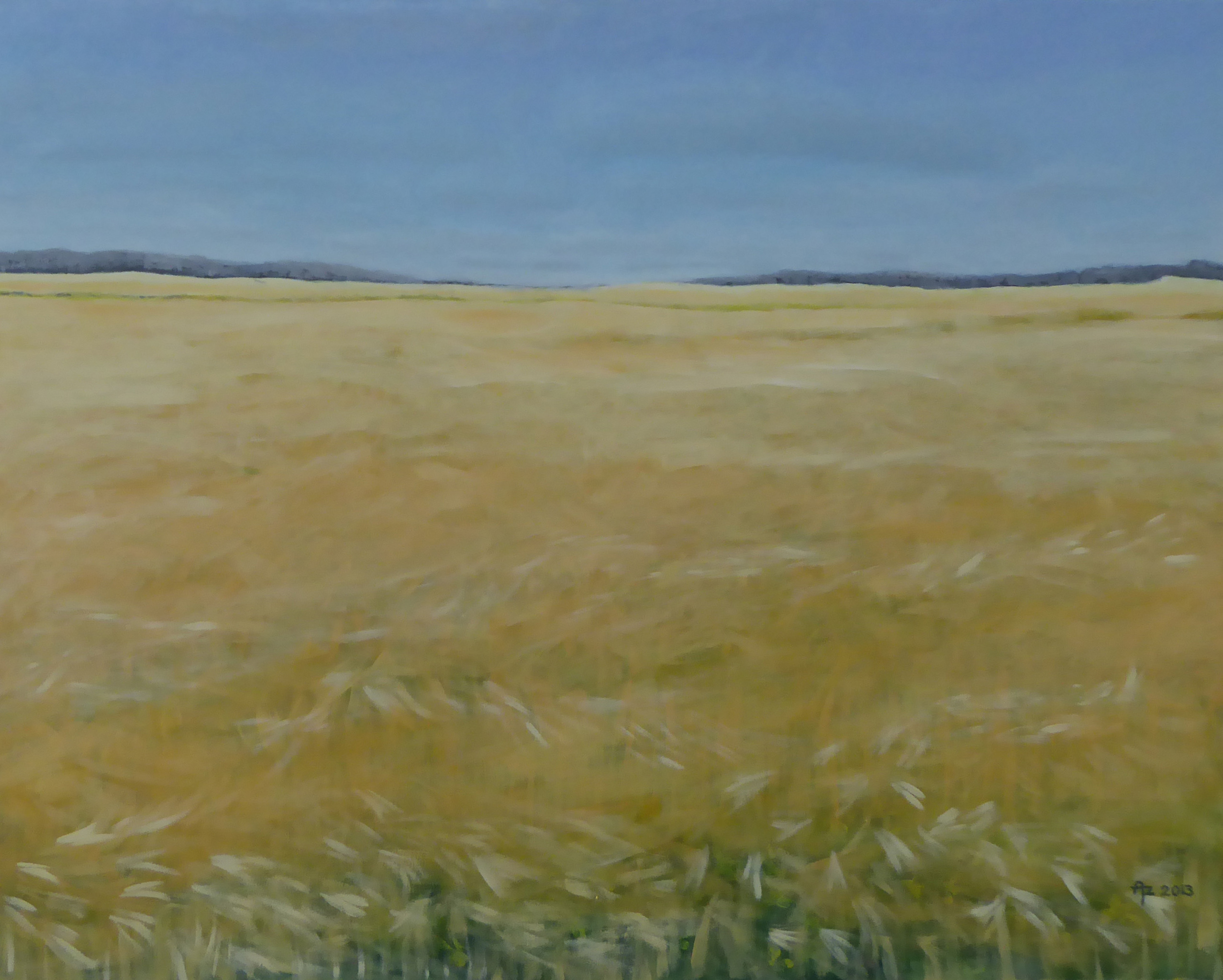 Akker met wuivend graan. Je voelt de warmte en de wind als je er naar kijkt.