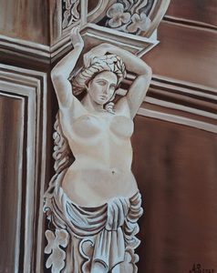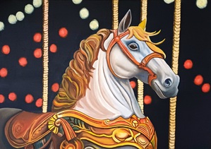 Tijdens mijn vakantie in Toscane, Italië, kwam ik dit carrouselpaard tegen. De prachtige klassieke carrousel, met zijn gouden krullen en schitterende lampjes, maakte een diepe indruk op mij. Dit schilderij, gecreëerd met olieverf op canvas, heeft een afmeting van 70 x 50 cm en bevat subtiele accenten van bladgoud. Het kunstwerk is omlijst met een antieke goudkleurige lijst.