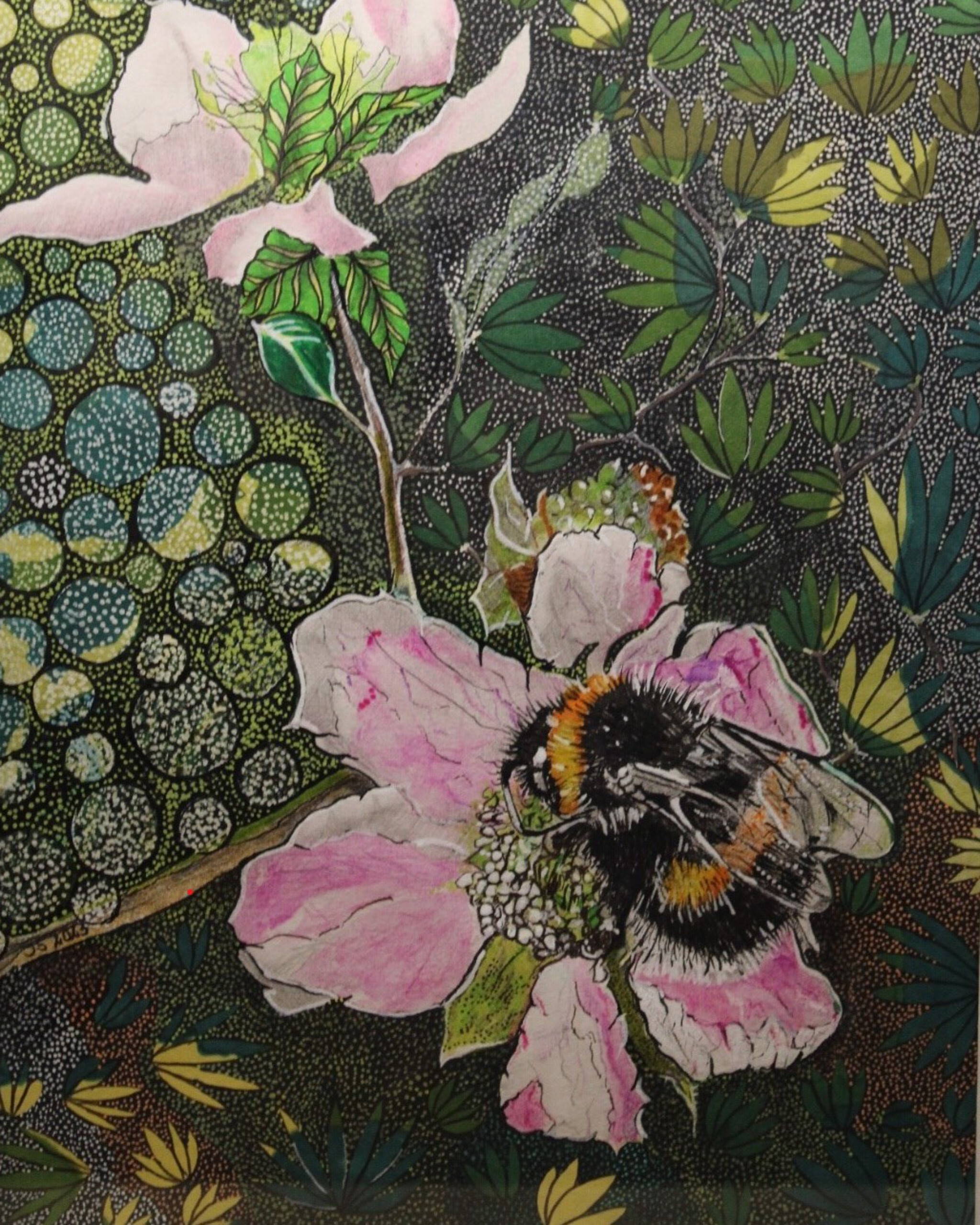 Deze tekening vangt een close-up moment waarin een hommel neerstrijkt op een roze bloem. De hommel is het duidelijke middelpunt: zijn pluizige vacht, warme oranje accenten en transparante vleugels maken hem levendig en aanwezig. Hij lijkt volledig op te gaan in zijn taak, alsof de wereld om hem heen even niet bestaat. De bloem waarop hij zit oogt zacht en kwetsbaar. De lichtroze blaadjes vormen een mooi contrast met de donkere, gedetailleerde achtergrond. Je voelt de fragiliteit van het bloemblaadje tegenover de vastberaden beweging van de hommel. Het samenspel van beide benadrukt de harmonie tussen dier en plant, een subtiele samenwerking die essentieel is voor het leven in de natuur. De achtergrond is rijk gevuld met stippen en organische vormen, bijna abstract. Deze structuur geeft diepte en dynamiek aan het beeld, alsof het licht zelf in kleine deeltjes door de scène beweegt. Tussen de patronen verschijnen bladeren die een natuurlijke omlijsting vormen, waardoor het geheel een bijna meditatieve rust krijgt. Wat deze tekening zo krachtig maakt, is de aandacht voor het kleine. Het laat zien dat iets eenvoudig en alledaags — een hommel op een bloem — een moment van schoonheid en betekenis kan zijn. De fijnzinnige details en warme kleuren benadrukken dat deze kleine ontmoeting een wereld op zich vormt: een stille viering van leven, beweging en balans.
