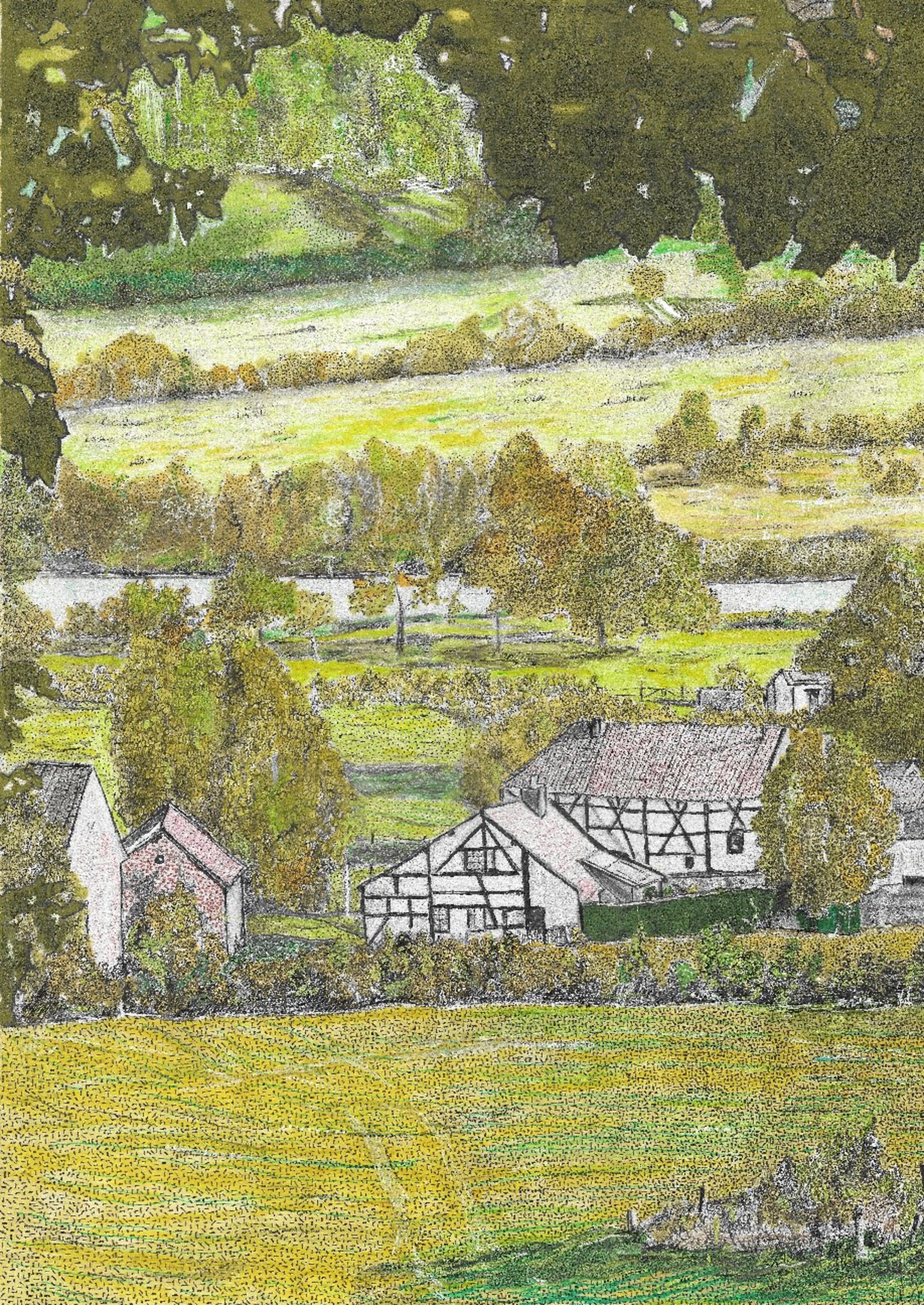 Deze tekening laat een vriendelijk, golvend landschap zien waarin natuur en dorpsleven harmonieus samenkomen. Vanuit een plek in de schaduw kijk je uit over een zonnige vallei. De donkere bladeren bovenaan vormen een beschermend kader, waardoor het lijkt alsof je even verscholen staat terwijl je de ruimte onder je observeert. Beneden liggen enkele vakwerkhuizen en boerderijen, karakteristiek voor een landelijke streek. Ze ogen stevig en vertrouwd, alsof ze al lange tijd deel uitmaken van het landschap. De vallei strekt zich breed uit in lichte groentinten, zachte gelen en warme aardschakeringen. Verderop glinstert een strook water, die het licht vangt en een gevoel van openheid aan de scène toevoegt. De heuvels op de achtergrond suggereren beweging en richting: het landschap gaat verder dan wat je in één oogopslag kunt bevatten. Het geheel ademt kalmte. Er is geen haast, geen drukte, alleen de stille samenwerking tussen mens en natuur. Je kijkt naar een plek waar tijd traag beweegt en waar het licht zacht over de velden glijdt. Het is een moment van overzicht en sereniteit, gevangen in één blik over berg en dal.