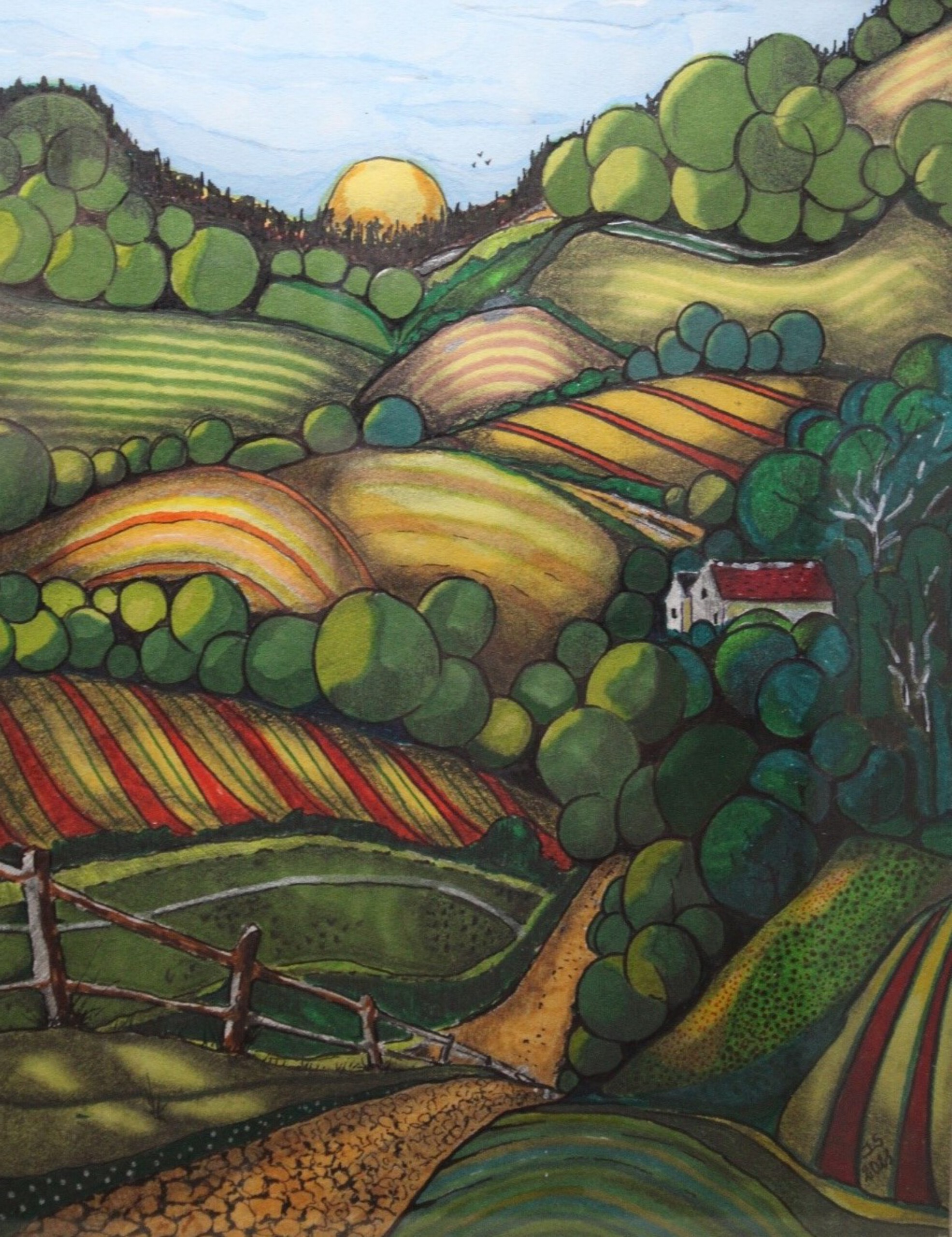 Deze tekening toont een landschap dat lijkt te golven als een levend organisme. De heuvels zijn opgebouwd uit brede stroken geel, groen, rood en oranje, alsof het land zelf uit kleurbanen bestaat. De ronde bomen die zich door het hele beeld slingeren versterken dat ritme: ze vormen kralen aan een ketting die het landschap begeleidt. Het kleine witte huisje, diep verscholen tussen de heuvels, vormt een ankerpunt in deze kleurrijke wereld. Het is een plek van rust midden in een landschap dat bruist van energie. De kleuren zijn helder en warm, en geven het gevoel dat het lente of vroege zomer is. Het licht is zacht, de lucht lichtblauw, alsof de dag nog jong is. De ronde vormen, felle lijnen en soepele overgangen creëren een sfeer die optimistisch en bijna sprookjesachtig aanvoelt. Onderaan rechts duiken donkere, meer gedetailleerde structuren op — een visueel tegengewicht voor de lichte lucht links. Dit contrast maakt het beeld dieper en sterker, alsof je vanuit schaduw naar licht kijkt. Samen vertelt de tekening een verhaal van beweging en rust, van mens en natuur in harmonie. Het is een landschap dat niet alleen bekeken wordt, maar ook gevoeld: warm, golvend en levendig, een vallei waarin de lente lijkt te ademen.