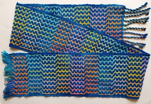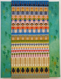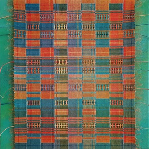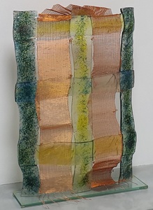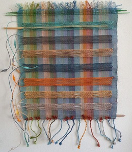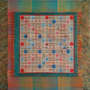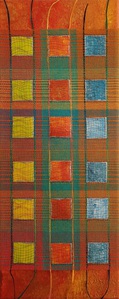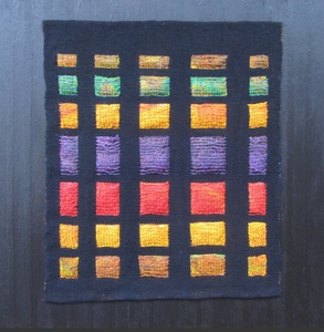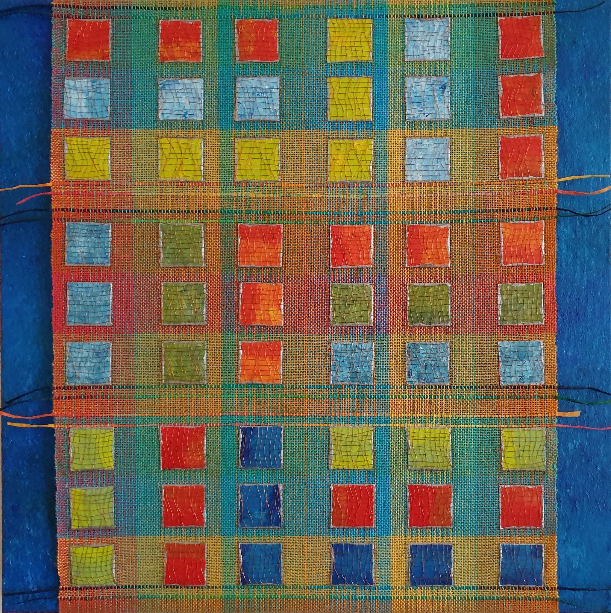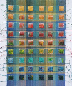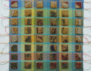 transparant dubbelweefsel met geschilderde blokjes, ontwerp kleur op kleur, cottolin, koperdraad en papiergaren, bevestigd op 3D canvas