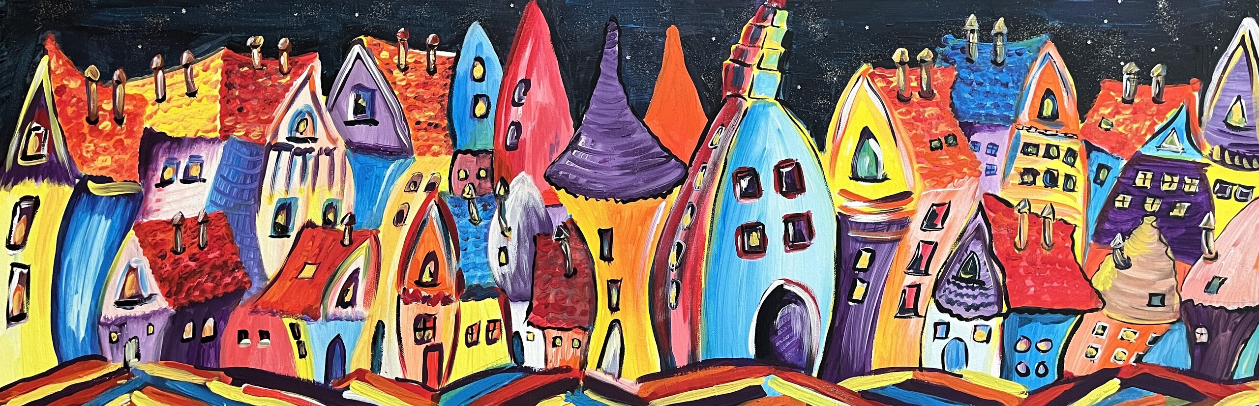 Vrolijke huisjes bij nacht, acryl op canvas 120x40 cm