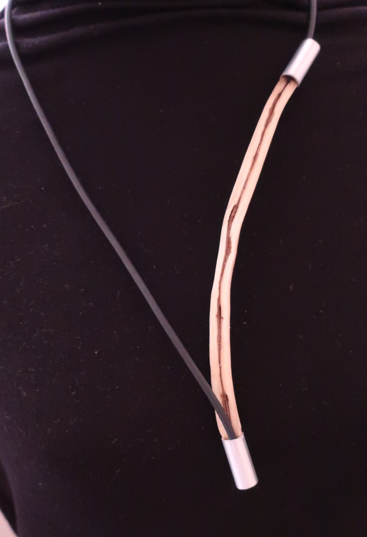 Een takje breekt open en onthult een meanderende kern. Vooral niet teveel aan doen. We maken een rubberen spang die met aluminium buis aan het takje bevestigd wordt. Door de vorm van het takje ontstaat een diagonaal te dragen sieraad dat in zijn eenvoud bijna overal bij past. En een sluiting is niet nodig door de rek die het rubber biedt.