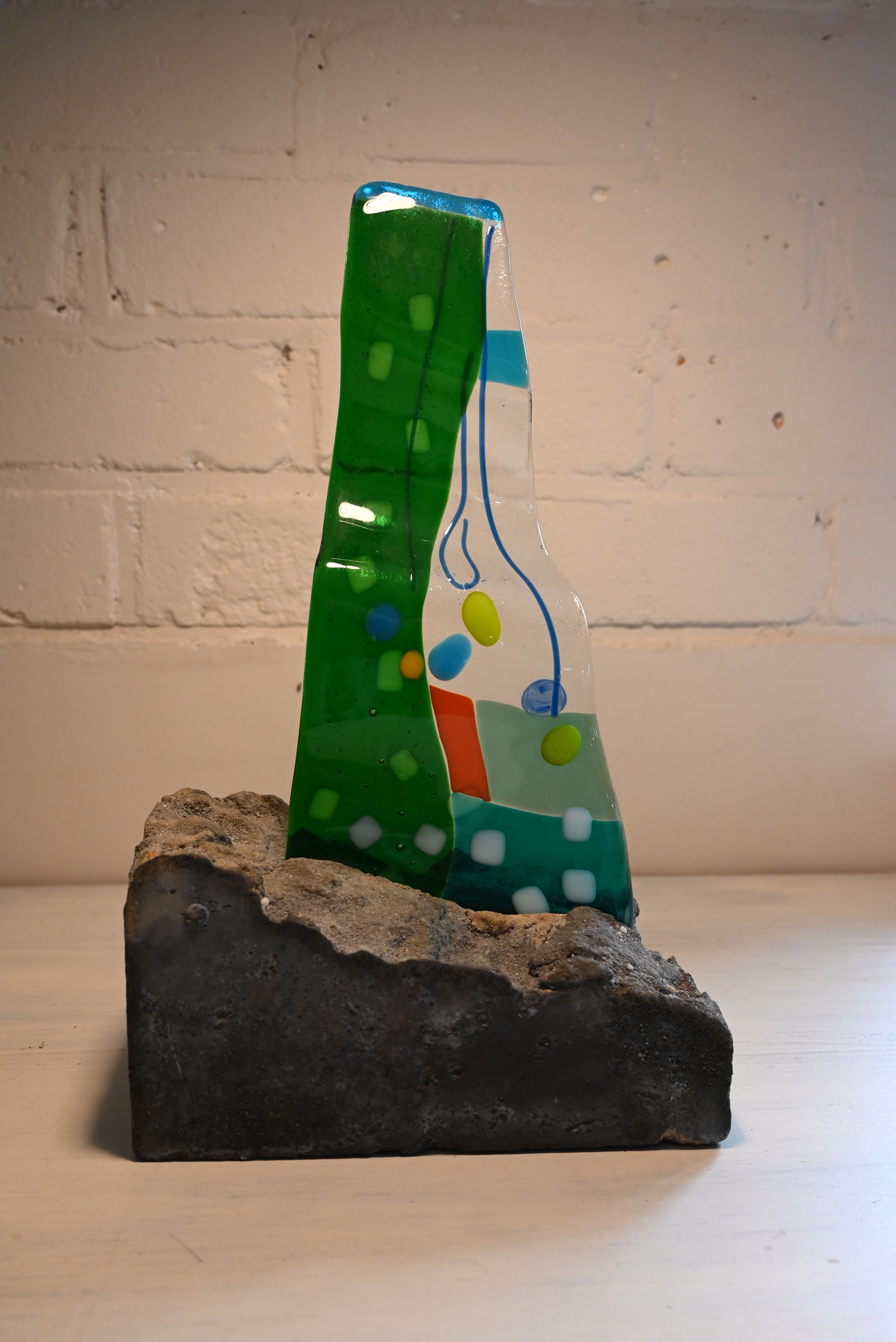 Object van glas en beton groen, geschikt voor buiten, glasfusing
