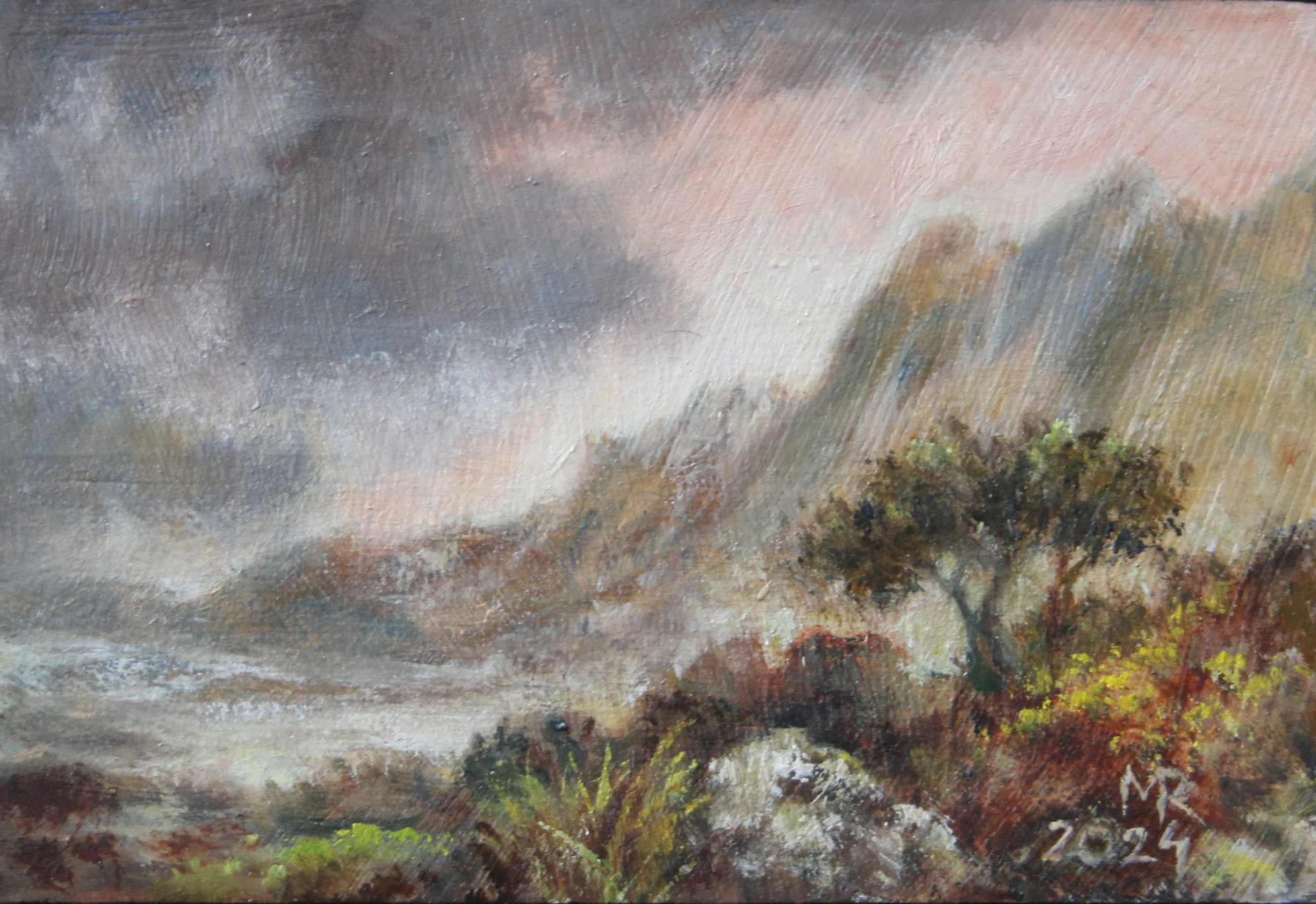Uit de serie “Droomlandschapjes”: Een fantasie schilderijtje(olieverf/paneel), ontstaan uit een abstract vlekkenpatroon waarbij het voor mij ook altijd een verrassing is wat eruit komt. Inclusief de lijst zijn de maten 16 x 21 cm.