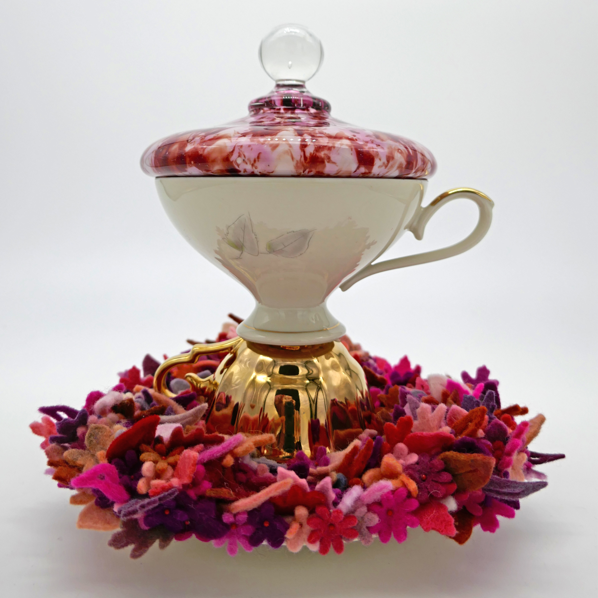 Deels handgeverfd wol vilt, kapot keramiek (Wegdwood & Kaiser & Bavaria Feltmann Vohenstrauß), geblazen art nouveau glazen deksel, spelden (deksel aan binnenzijde bekleed met vilt decoratie, kleurstelling als op schotel).