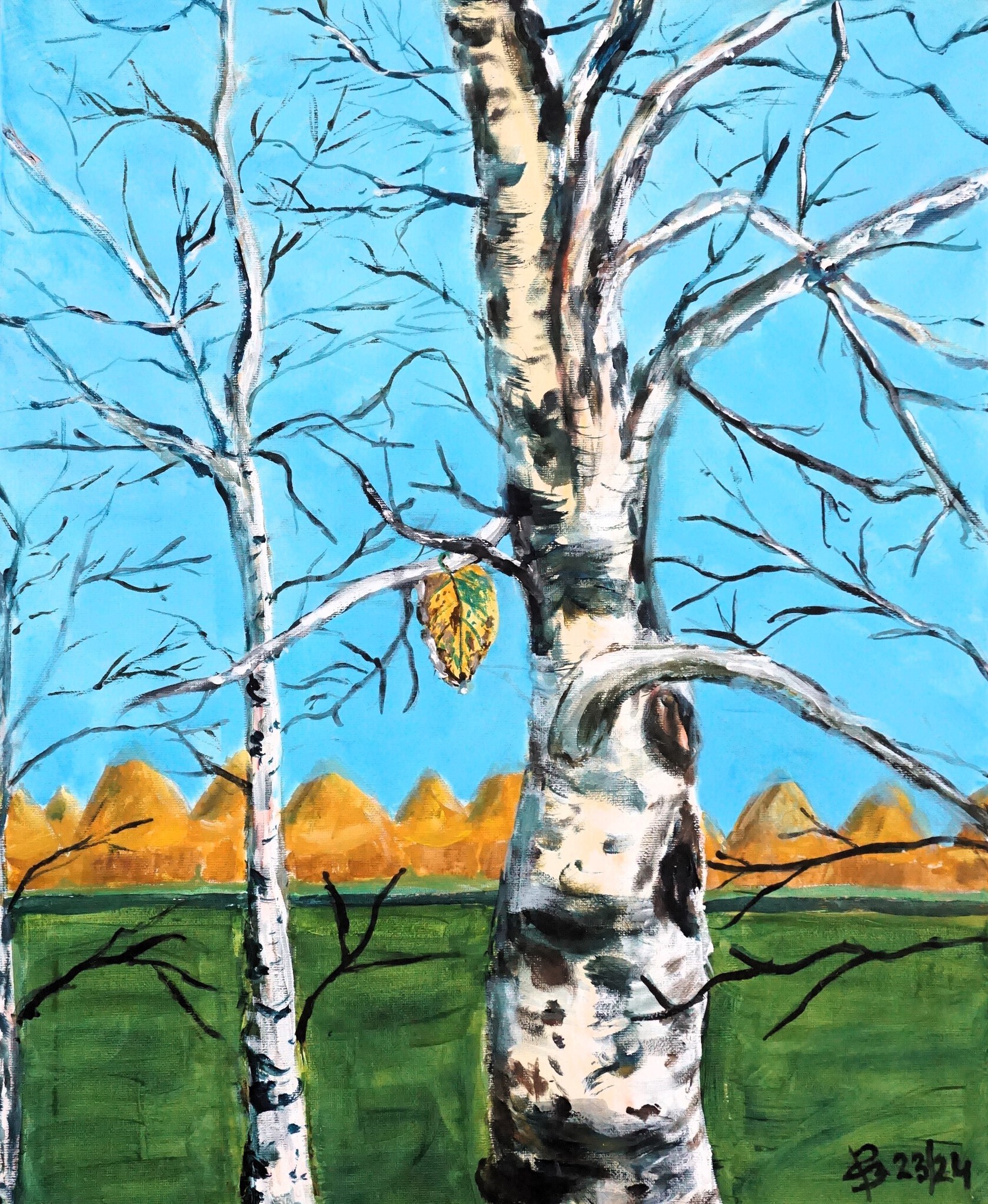 in 2023, maakte ik naar een foto uit de jaren 50, dit schilderij met Zilverberken en hooibulten. (Die zie je nu nooit meer, nu zijn het pakjes of rollen) Maar toen ik het lied LAST LEAF hoorde, wist ik dat ik er weer aan moest werken. De zijkanten zijn ook beschilderd, dus een lijst màg wel, maar hoeft niet.