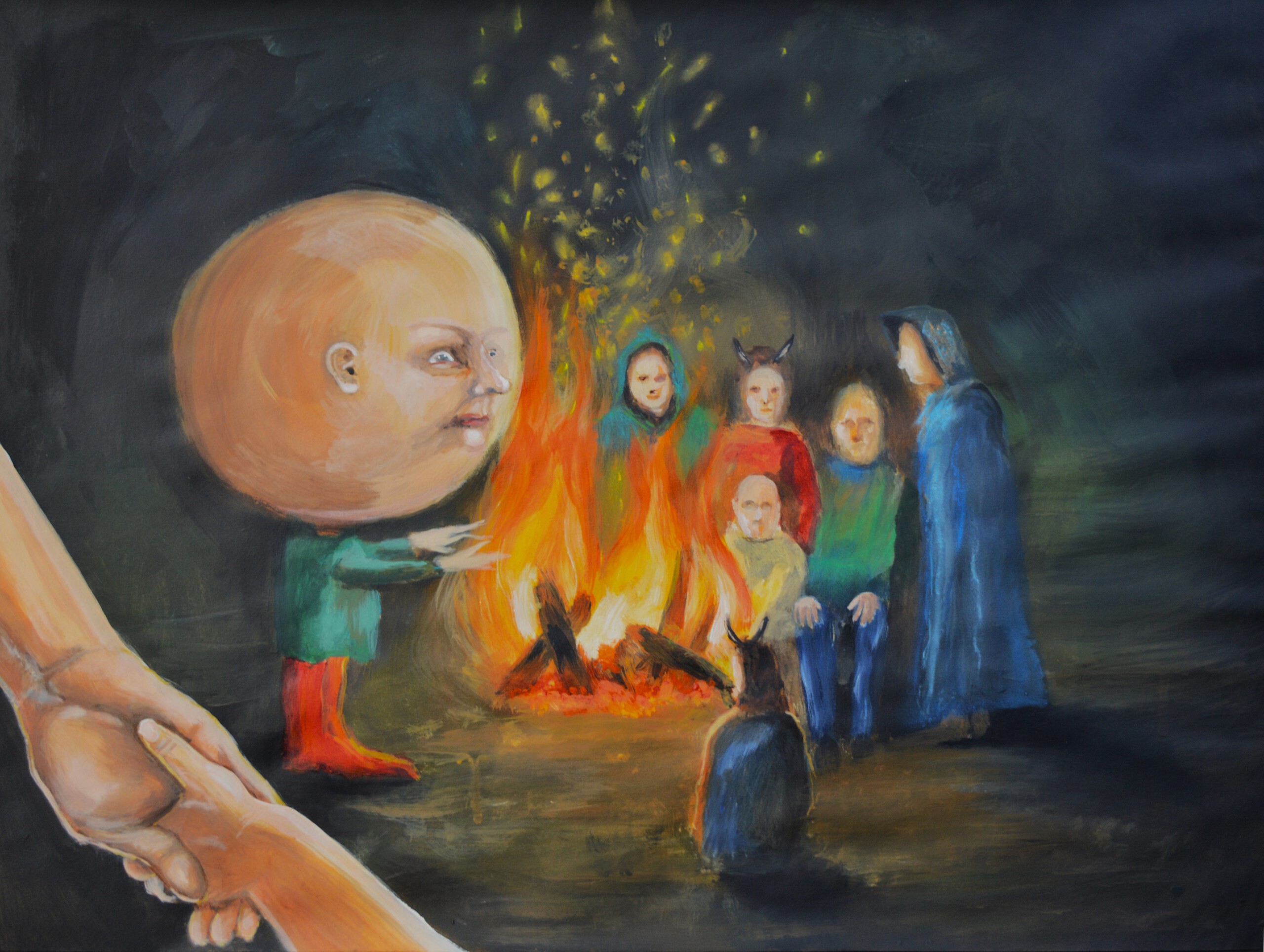 Ik was een jaar of drie, vier. Met mijn ouders, twee oudere zussen en broer, waren we met vakantie in Italië. We hadden een plek bezocht uit de oudheid in de avond en aan mijn vaders hand liepen we terug naar de camping in het donker. Links van ons zag ik in het veld een kampvuur. Er om heen zaten duistere figuren. Het figuur die mij het meest is bijgebleven had een enorm hoofd en leek de leider van de groep illustere figuren. Ik was bang voor wat ik zag. Toen mijn vader aan me vroeg waarvoor ik zo bang was, wees ik hem op het vreemde schouwspel. Hij zag het niet. Onlangs heb ik besloten te schilderen van wat ik toen zag.