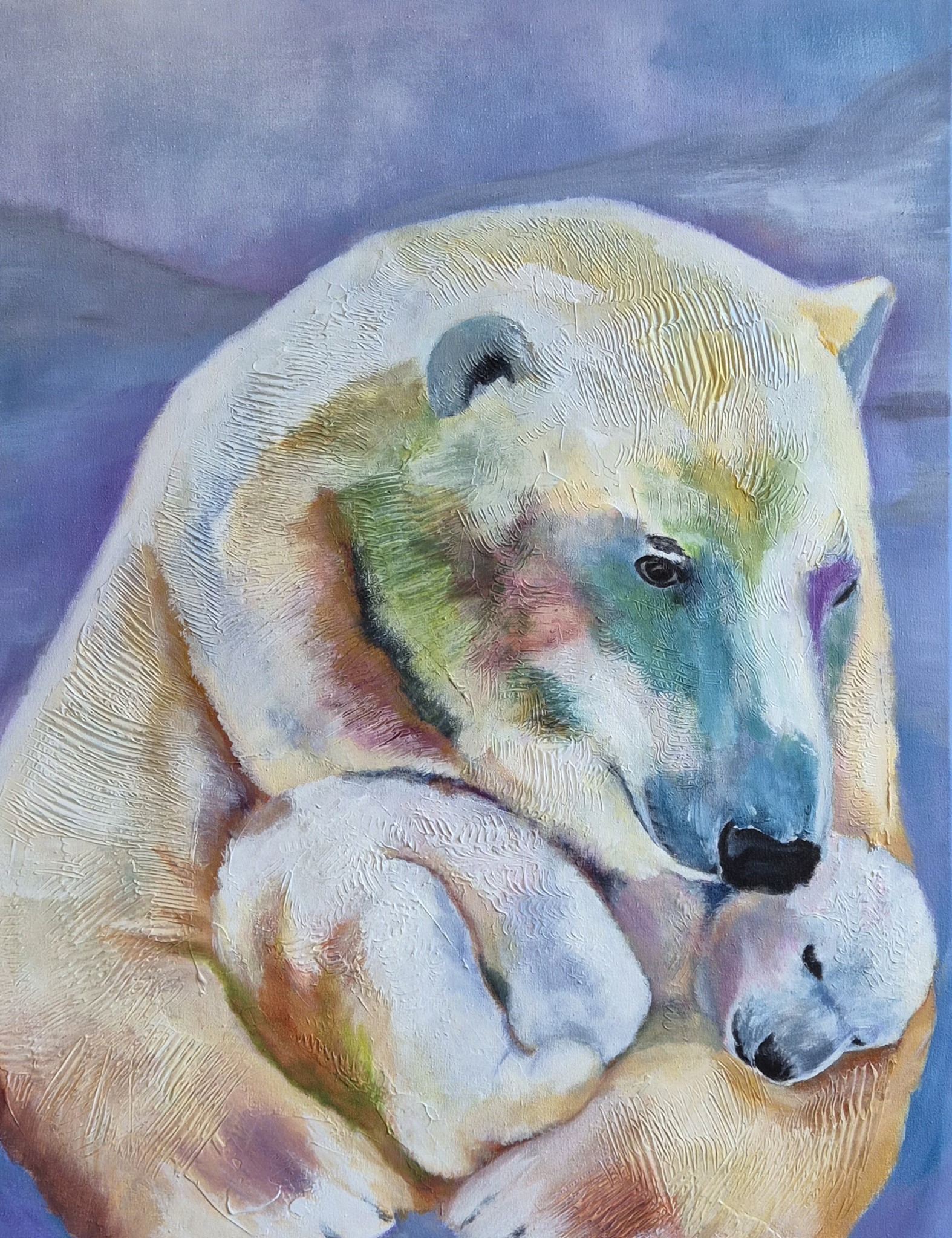 De liefde straalt van de moeder af. De eerste in de serie IJsbeer met jong. Dit schilderij is nu te koop met 20% korting