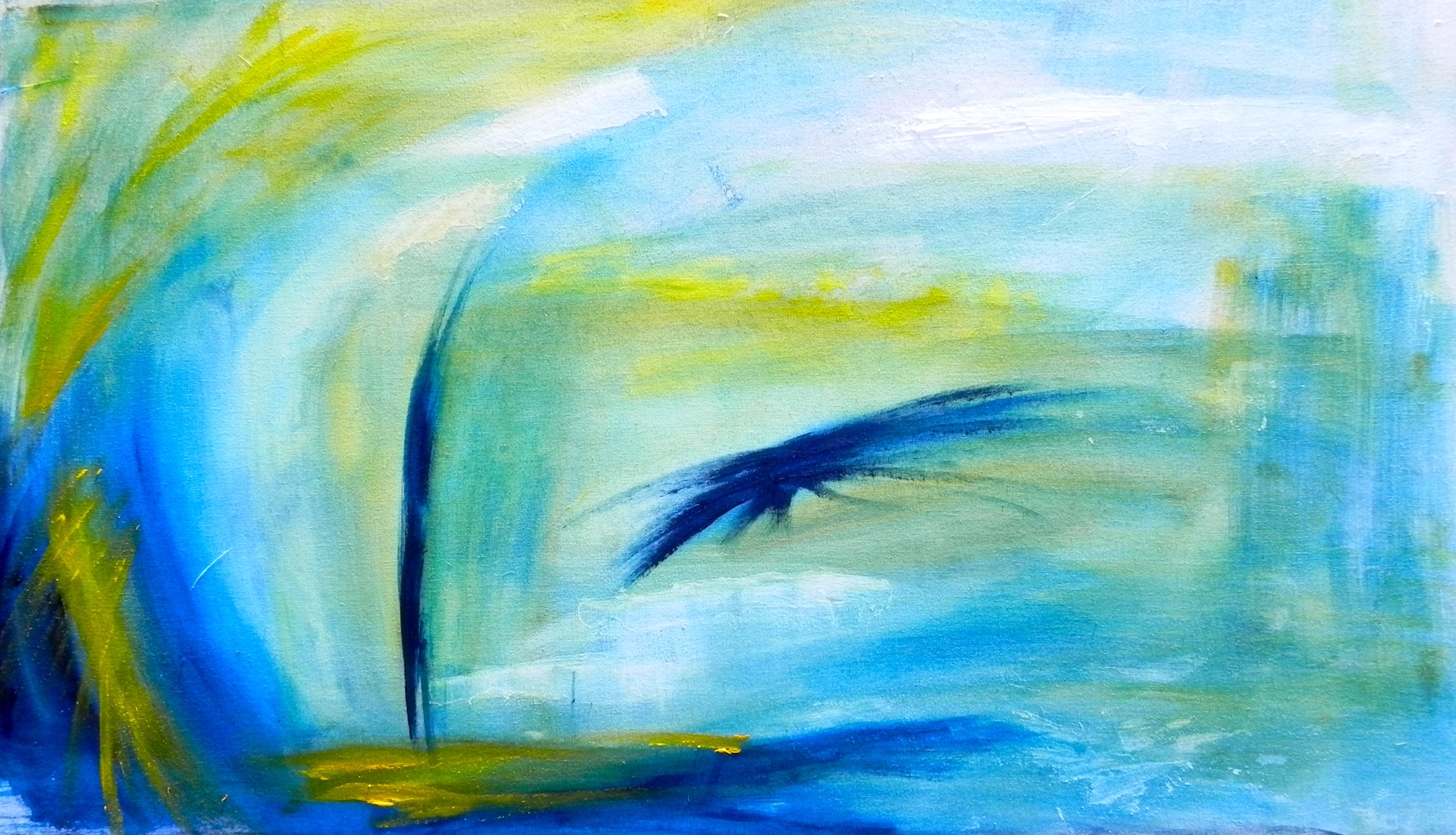Ademloos blauw, met geel gemengd en verbonden, zuigen je zachtjes de ruimte in ... ca 59 x 96 cm, acrylverf op doek, ingelijst, thuisgekomen in een dagopvang voor meervoudig gehandicapte kinderen, in Haarlem
