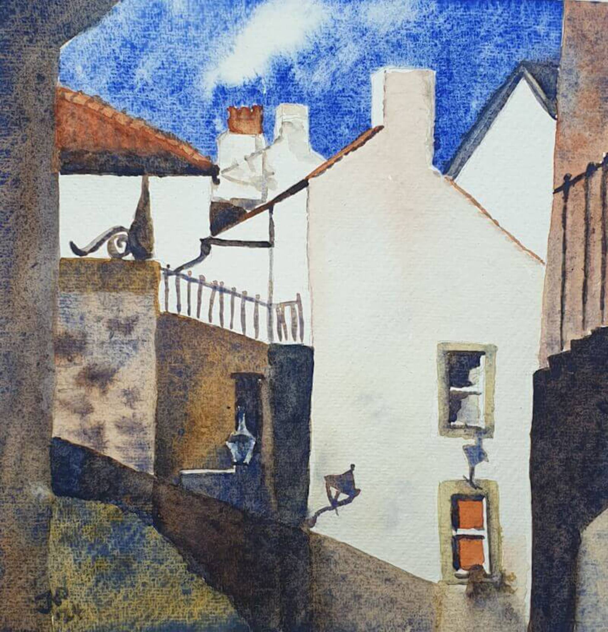 Impressie van huizen in het plaatsje Berwick aquarel op handgeschept katoen aquarelpapier. Dit plaatsje bezochten we tijdens onze reis naar Schotland in het prachtige NorthUmberland.
