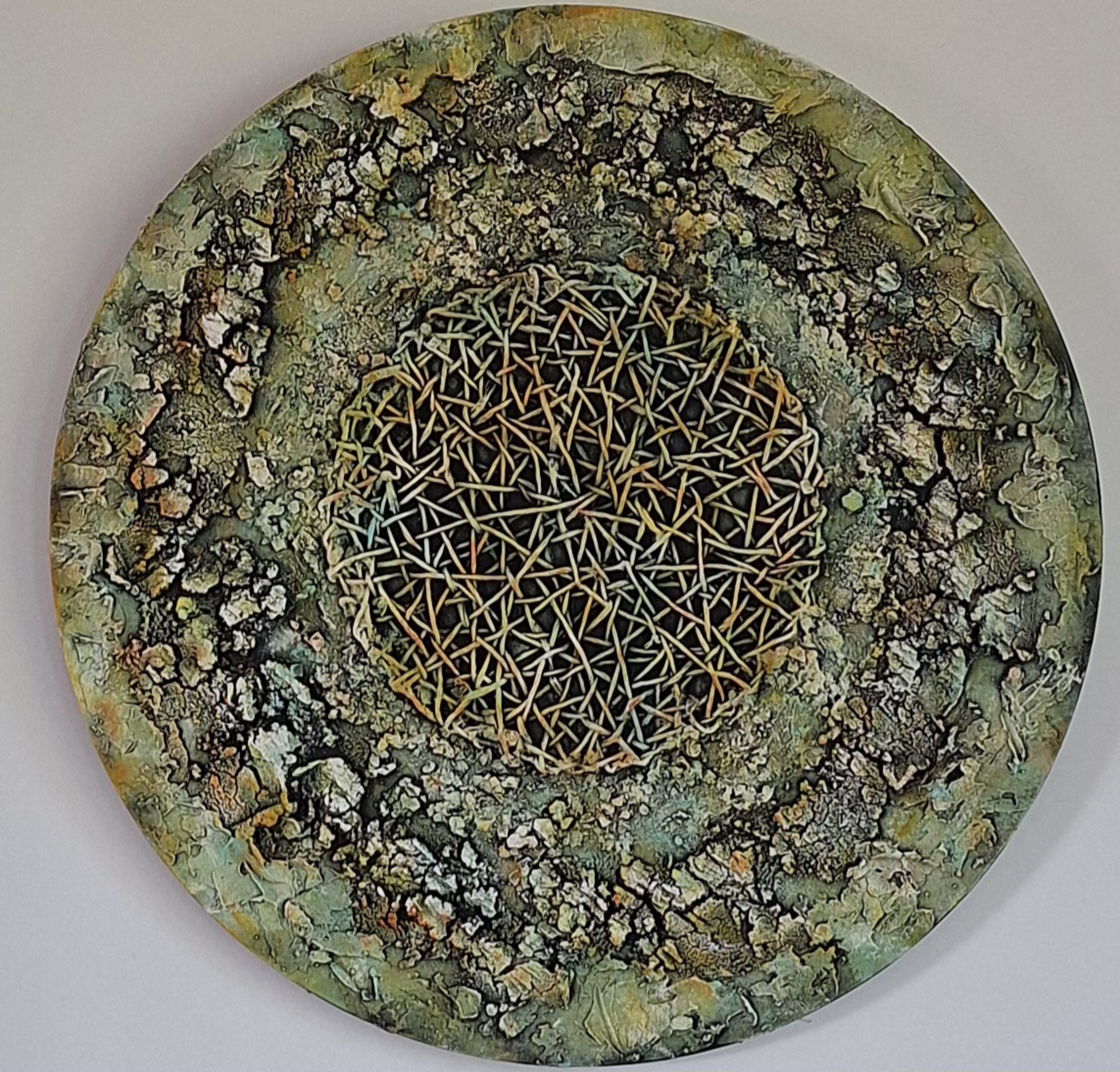 Uit de serie roundwego nr XI, doorsnee 80 cm Mixedmedia/materiekunst.
