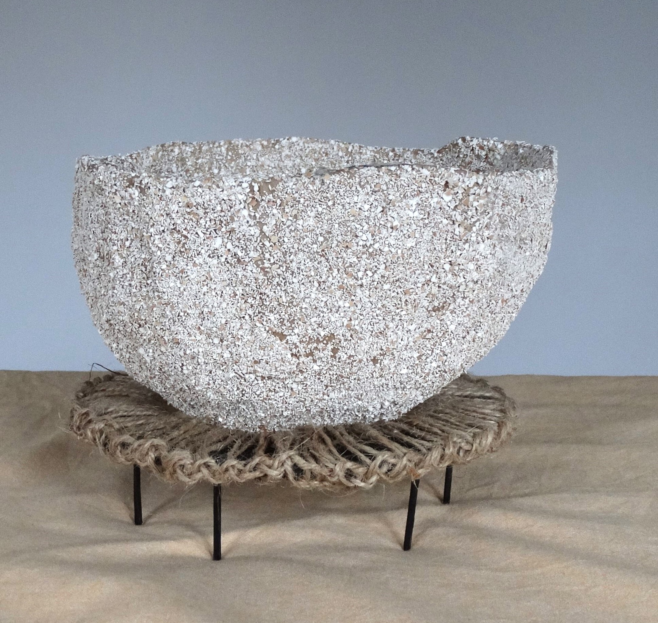 Schaal op pootjes bedekt met gekneusde eierschalen. Papier, hout, touw, eierschalen.