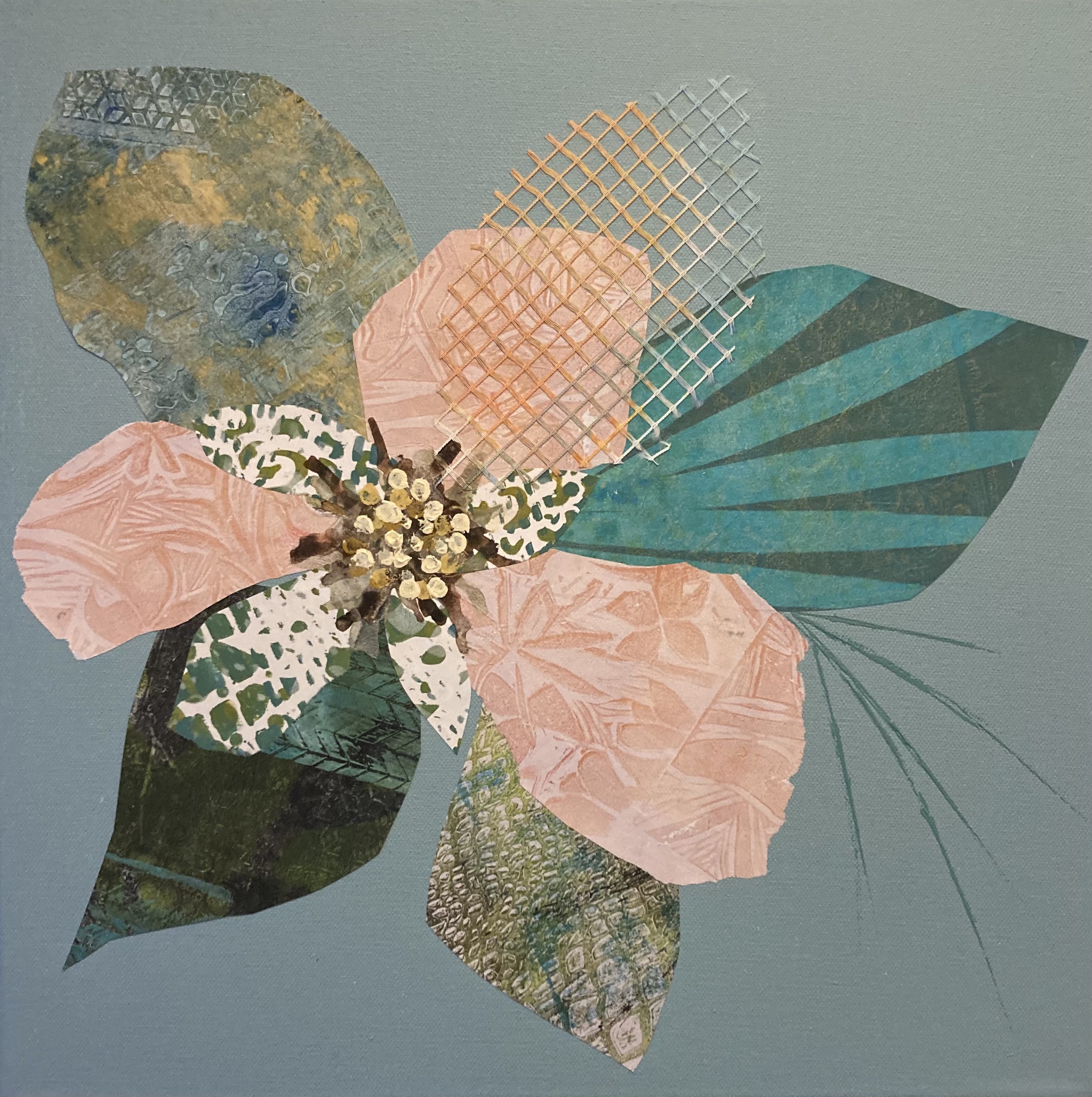 Collage van gel-prints, gemaakt met zelf ontworpen stempels, gecombineerd met acrylverf.