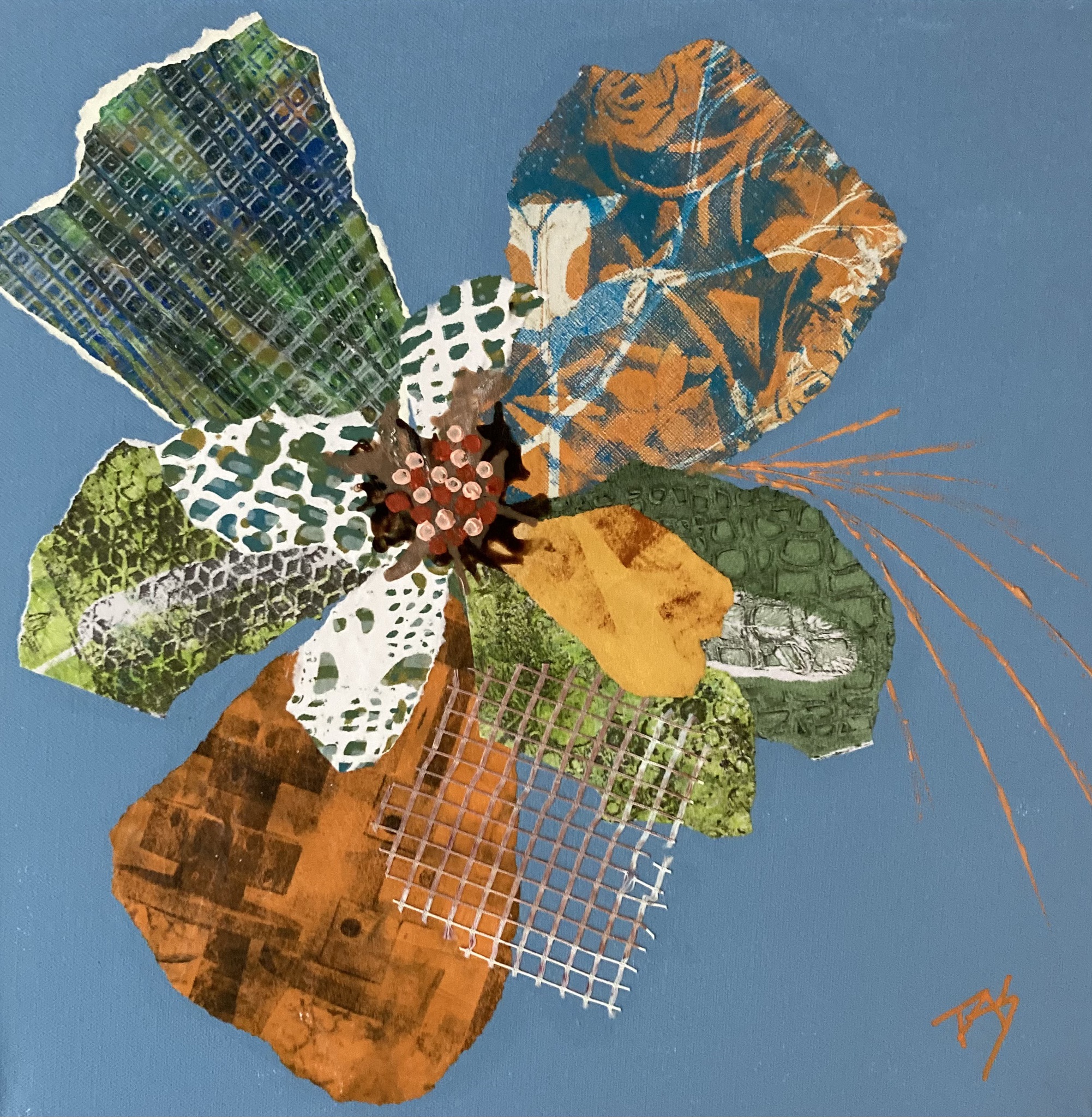 Collage van gel-prints, gemaakt met zelf ontworpen stempels, gecombineerd met acrylverf.