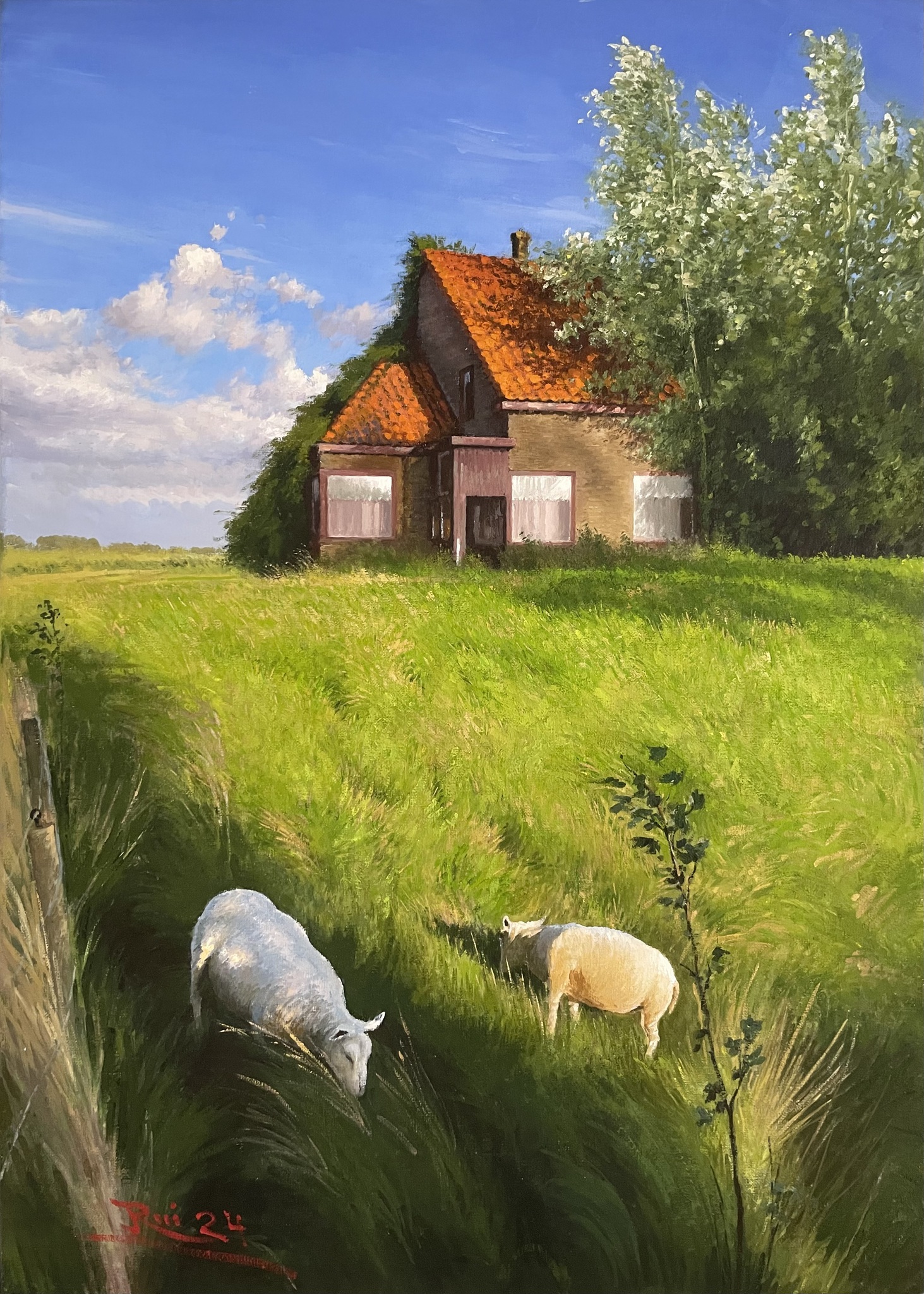 Enig boerenhuisje in Biesbosch met twee schapen op de grasoever van een klein riviertje.