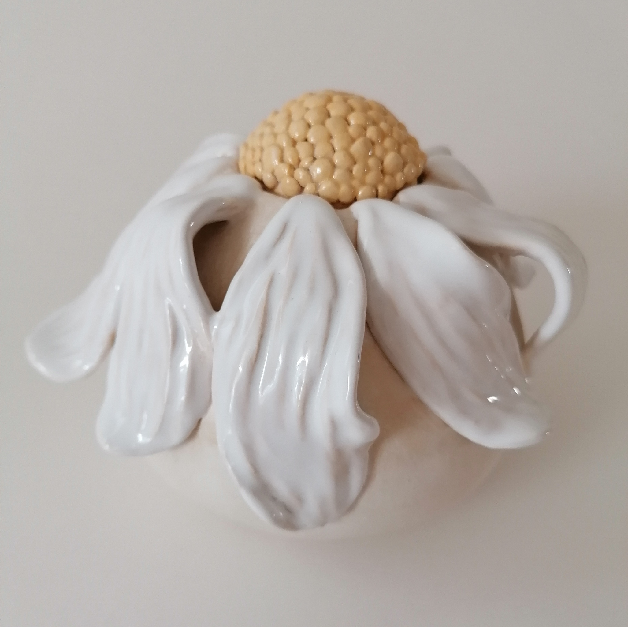 Deze mini urn is handgemaakt van keramiek. Het heeft een mat/zijdeglans op de urn en hoogglans op de bloem. Het gele hart is de dop, die na het vullen vastgelijmd kan worden. In een mini urn kan een deel van de as in bewaard worden. In de inhoud van deze urn is 600 gr. De urn kan alleen binnen bewaard worden.