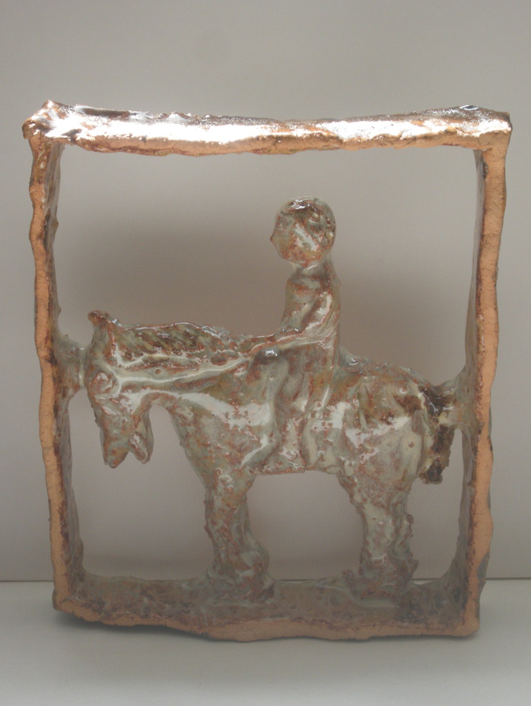 voorstelling van een kind te paard, gedeeltelijke geglazuurd, voor aan de muur binnen of buiten