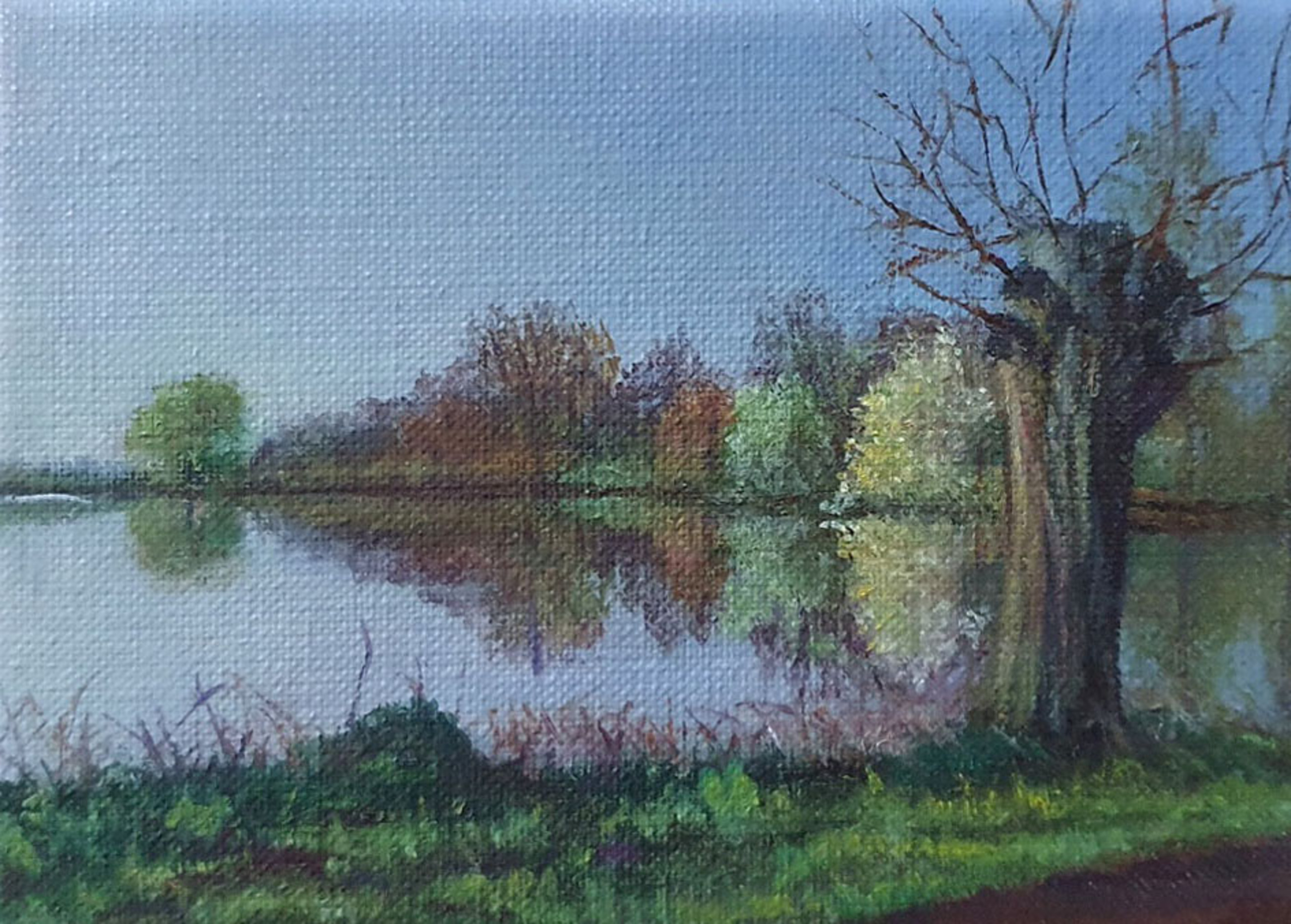 Een klein olieverfwerkje op canvas, ingelijst, van de Dommelvallei in Eindhoven bij het aanbreken van de dag. Op het water heerst rust en de natuur ontwaakt. Incl. lijst (inbegrepen) 16*21cm.