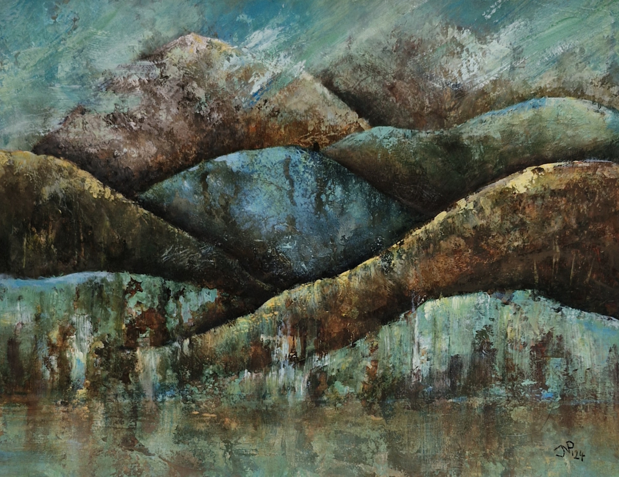 Tijdens mijn reis in Canada werd ik overweldigd door de rauwe schoonheid van de Rocky Mountains en de prachtige meren. Vanaf dat moment zijn in veel van mijn werk bergen en water op abastracte of fantasievolle wijze zichtbaar, zoals bij dit schilderij. Het bestaat uit diverse lagen acrylverf en acrylinkt opgebracht met paletmes en andere materialen.