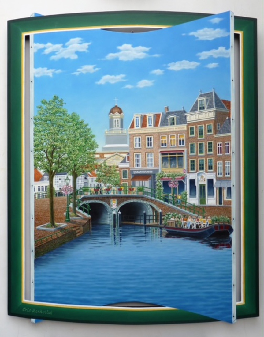 Eric Kerkvliet schildert met olieverf uiterst gedetailleerd voorstellingen op iets verhoogd paneel waardoor bij juiste belichting een Trompe-l’oeil-achtig effect ontstaat.