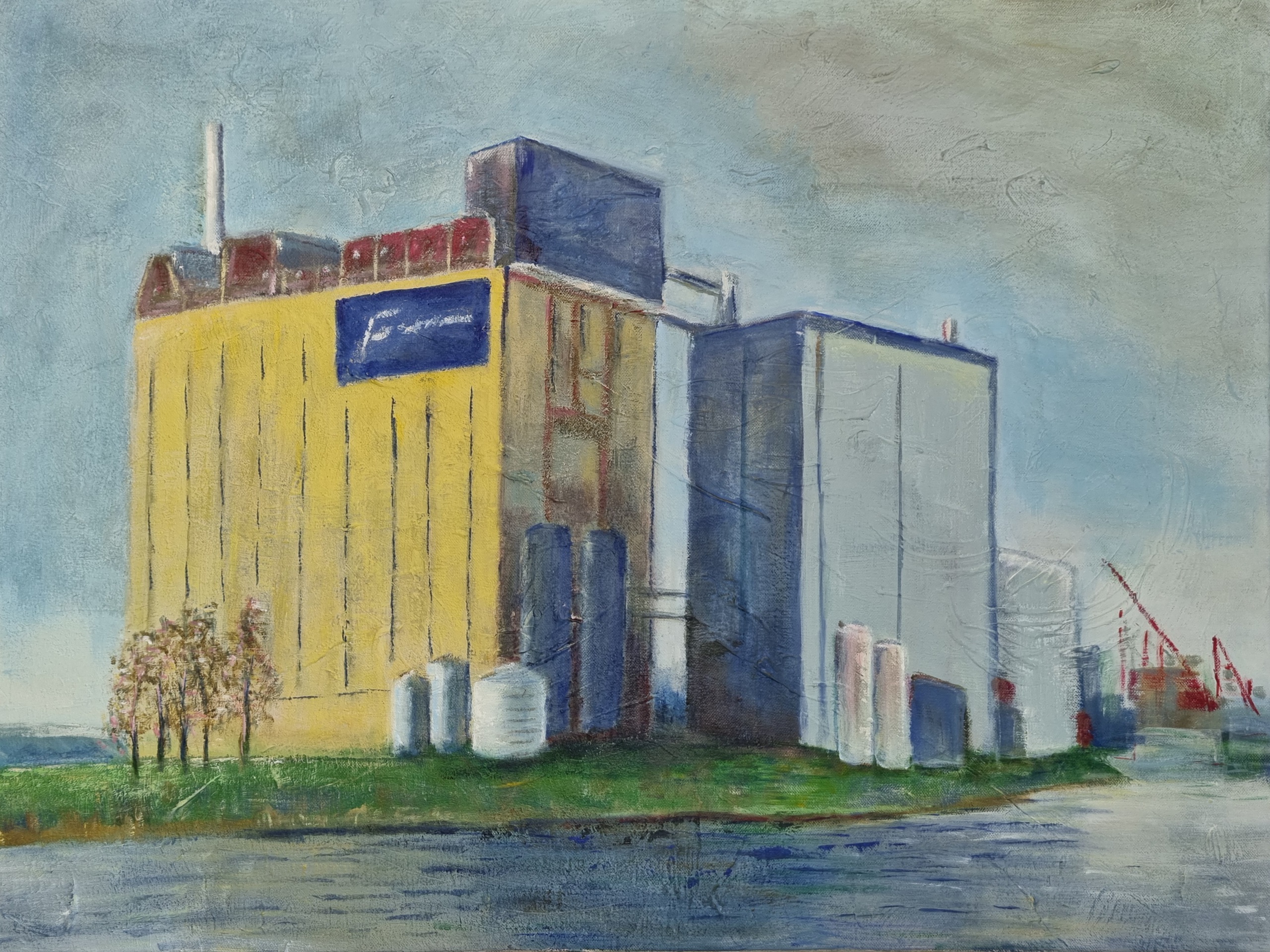 Industrieel onderwerp. Geschilderd op gebruikt doek met structuur. Zonder lijst.