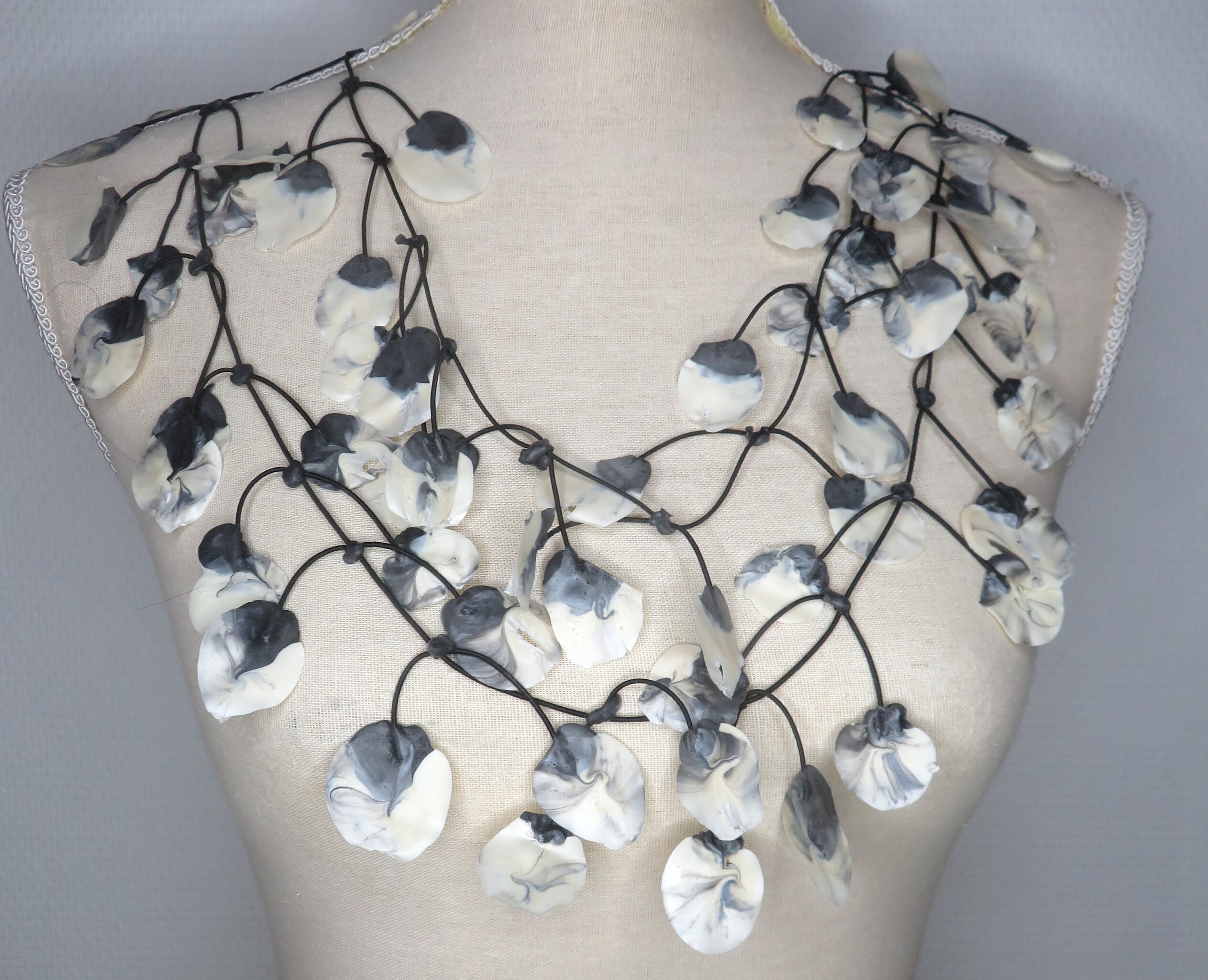 Ketting rubber met zwart wit. Deze ketting heeft lichte dunne blaadjes Deze ketting met blaadjes is licht om te dragen en geeft een mooi effect, De ketting is handgemaakt en weet u dat iedere ketting uniek is, ook proberen we mooie kleurcombinaties of vormen van de blaadjes te maken Schitterend op een egale jurk of bloese een echte statement ketting